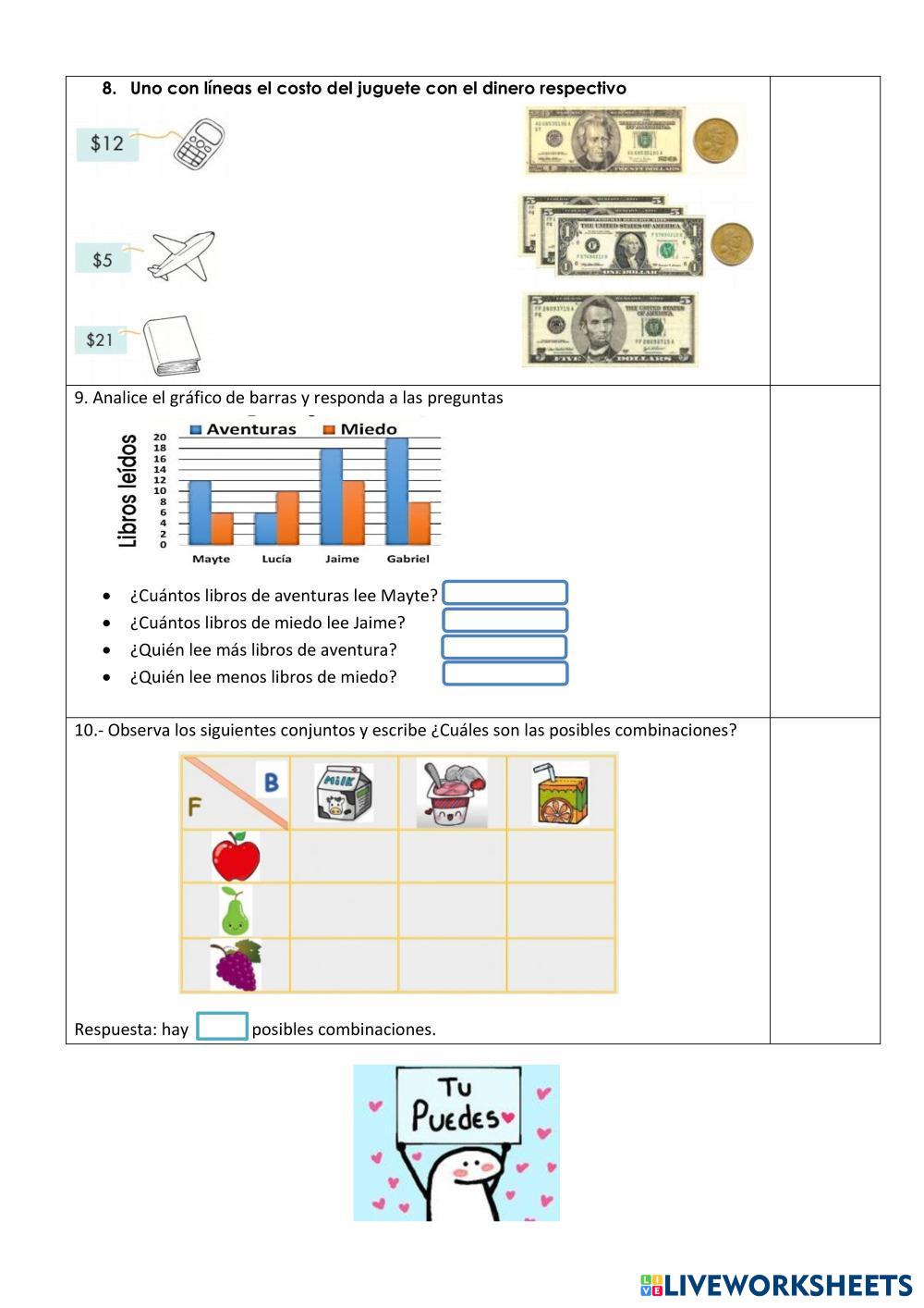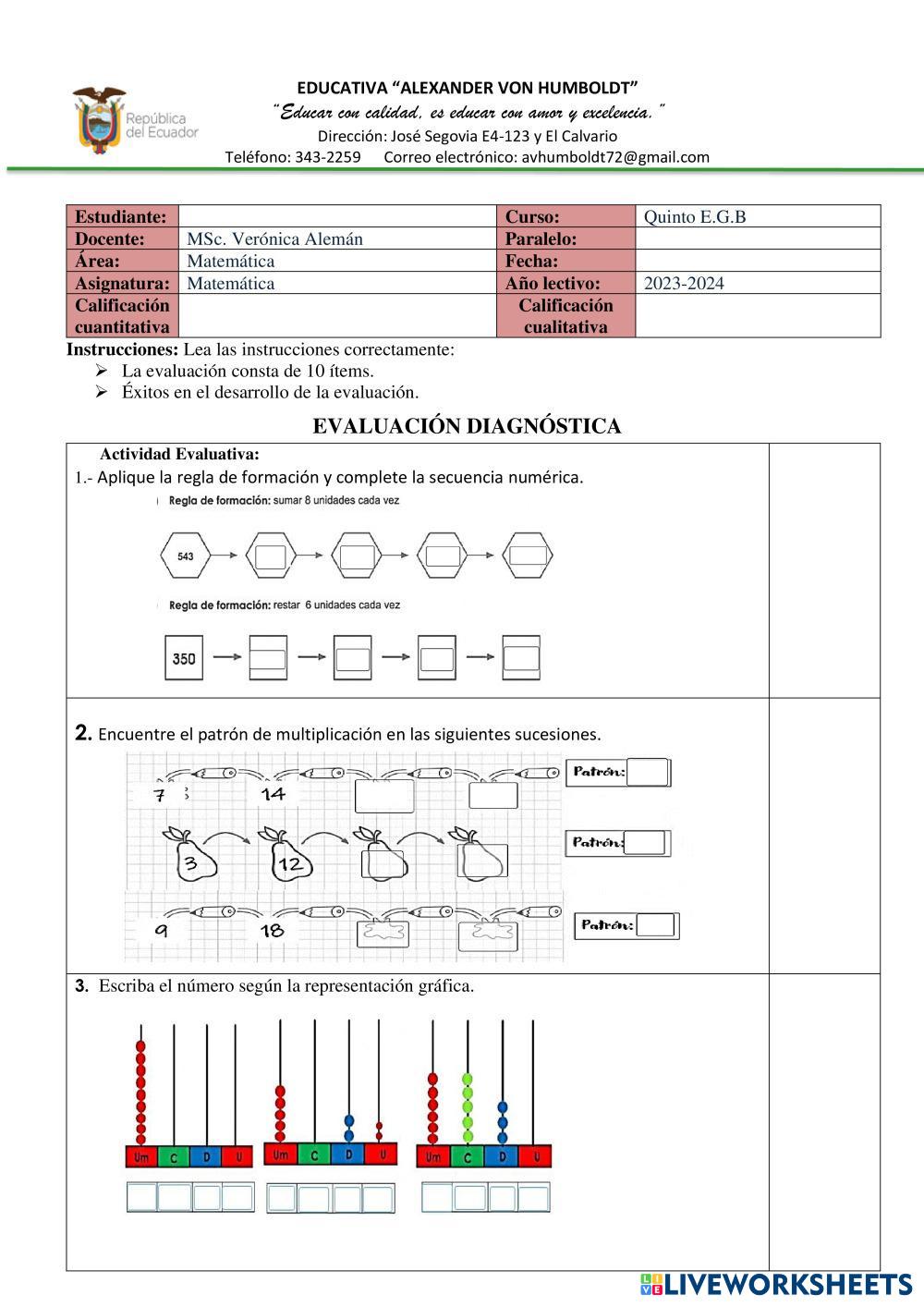 Created byVERITO ALEMAN VALENZUELA Matemáticas Diagnóstico Age 9-14 level: 5TO Spanish Author's Instructions My Google Classroom Courses × 0 classes selected (0 students total) Quick Access Select all classes (0 classes) All Classes Loading courses... Cancel Share Share to selected Course __COURSE_NAME__ __STUDENT_NAME__ (__STUDENT_EMAIL__) EVALUACIÓN DIAGNÓSTICA MATEMÁTICA Download Worksheet Validation Check my answers Emails my answers to my teacher Full name Group/level School subject Teacher's email or key code Close Submit Validating worksheet... (12) Your answers have been sent to your teacher. Good luck! OK We encountered an error submitting your answers. Please try again. OK Advertisement | Go Ad Free Created byVERITO ALEMAN VALENZUELA Matemáticas Diagnóstico Age 9-14 level: 5TO Spanish Author's Instructions