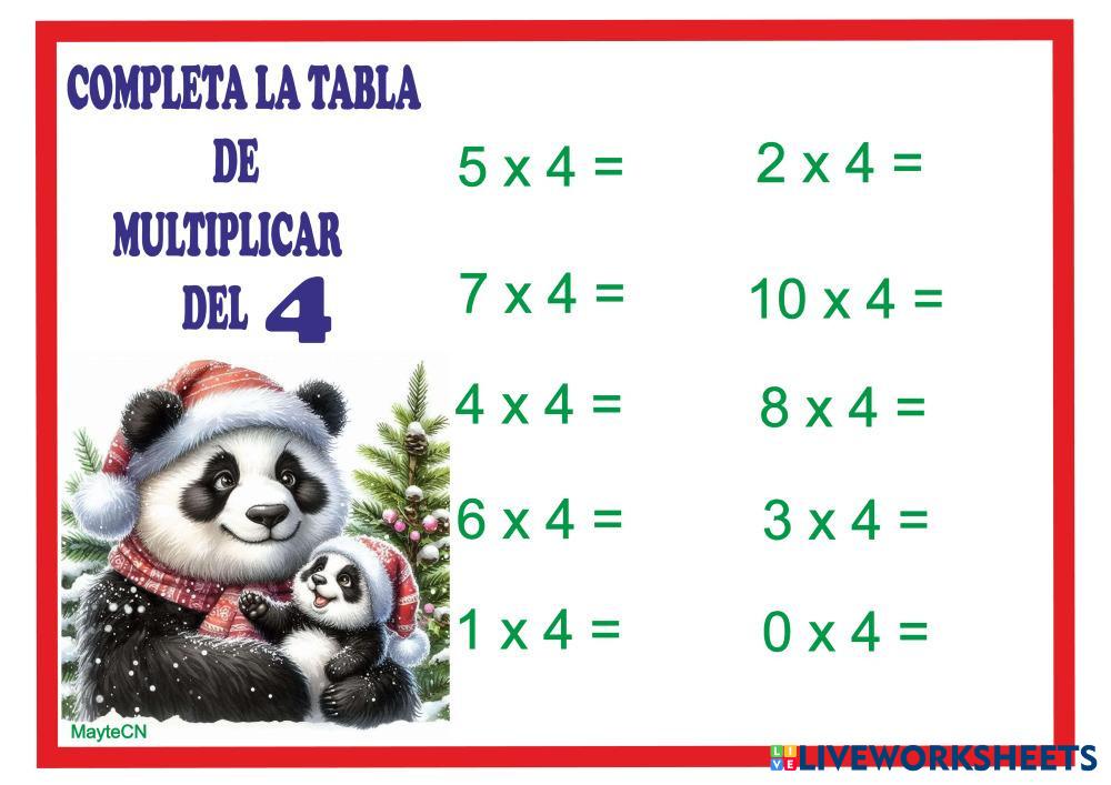 Created byLuz Mayte Correa Nazco Matemáticas Las tablas de multiplicar Age 7-15 level: 3º Spanish Author's Instructions My Google Classroom Courses × 0 classes selected (0 students total) Quick Access Select all classes (0 classes) All Classes Loading courses... Cancel Share Share to selected Course __COURSE_NAME__ __STUDENT_NAME__ (__STUDENT_EMAIL__) Tabla de multiplicar del 4 salteada Download Worksheet Validation Check my answers Emails my answers to my teacher Full name Group/level School subject Teacher's email or key code Close Submit Validating worksheet... (12) Your answers have been sent to your teacher. Good luck! OK We encountered an error submitting your answers. Please try again. OK Advertisement | Go Ad Free Created byLuz Mayte Correa Nazco Matemáticas Las tablas de multiplicar Age 7-15 level: 3º Spanish Author's Instructions