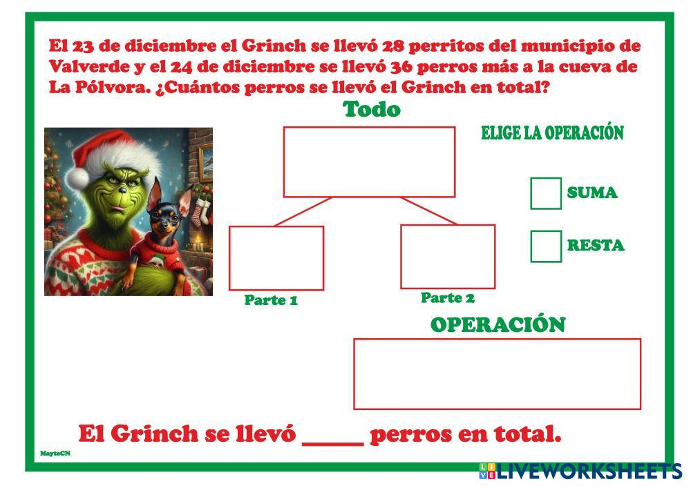 Created byLuz Mayte Correa Nazco Matemáticas Resolución de problemas Age 7-15 level: 3º Spanish Author's Instructions My Google Classroom Courses × 0 classes selected (0 students total) Quick Access Select all classes (0 classes) All Classes Loading courses... Cancel Share Share to selected Course __COURSE_NAME__ __STUDENT_NAME__ (__STUDENT_EMAIL__) Problema del Grinch. 2 operaciones. Download Worksheet Validation Check my answers Emails my answers to my teacher Full name Group/level School subject Teacher's email or key code Close Submit Validating worksheet... (12) Your answers have been sent to your teacher. Good luck! OK We encountered an error submitting your answers. Please try again. OK Advertisement | Go Ad Free Created byLuz Mayte Correa Nazco Matemáticas Resolución de problemas Age 7-15 level: 3º Spanish Author's Instructions