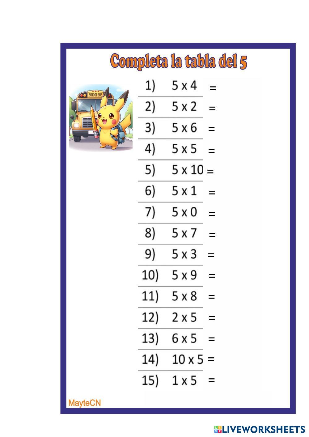 Created byLuz Mayte Correa Nazco Matemáticas Las tablas de multiplicar Age 7-15 level: 3º Spanish Author's Instructions My Google Classroom Courses × 0 classes selected (0 students total) Quick Access Select all classes (0 classes) All Classes Loading courses... Cancel Share Share to selected Course __COURSE_NAME__ __STUDENT_NAME__ (__STUDENT_EMAIL__) Completa la tabla del 5 salteada. Download Worksheet Validation Check my answers Emails my answers to my teacher Full name Group/level School subject Teacher's email or key code Close Submit Validating worksheet... (12) Your answers have been sent to your teacher. Good luck! OK We encountered an error submitting your answers. Please try again. OK Advertisement | Go Ad Free Created byLuz Mayte Correa Nazco Matemáticas Las tablas de multiplicar Age 7-15 level: 3º Spanish Author's Instructions