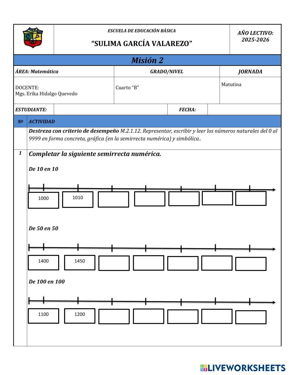 Created byErika Hidalgo Matemáticas Unidad de mil Age 8-12 level: cuarto grado Spanish Author's Instructions My Google Classroom Courses × 0 classes selected (0 students total) Quick Access Select all classes (0 classes) All Classes Loading courses... Cancel Share Share to selected Course __COURSE_NAME__ __STUDENT_NAME__ (__STUDENT_EMAIL__) Semirrecta numérica Unidad de mil Download Worksheet Validation Check my answers Emails my answers to my teacher Full name Group/level School subject Teacher's email or key code Close Submit Validating worksheet... (12) Your answers have been sent to your teacher. Good luck! OK We encountered an error submitting your answers. Please try again. OK Advertisement | Go Ad Free Created byErika Hidalgo Matemáticas Unidad de mil Age 8-12 level: cuarto grado Spanish Author's Instructions
