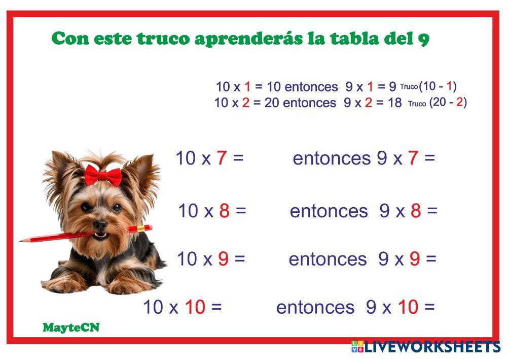 Created byLuz Mayte Correa Nazco Matemáticas Las tablas de multiplicar Age 7-15 level: 3º Spanish Author's Instructions My Google Classroom Courses × 0 classes selected (0 students total) Quick Access Select all classes (0 classes) All Classes Loading courses... Cancel Share Share to selected Course __COURSE_NAME__ __STUDENT_NAME__ (__STUDENT_EMAIL__) Practica las tablas del 9 y del 10. Download Worksheet Validation Check my answers Emails my answers to my teacher Full name Group/level School subject Teacher's email or key code Close Submit Validating worksheet... (12) Your answers have been sent to your teacher. Good luck! OK We encountered an error submitting your answers. Please try again. OK Advertisement | Go Ad Free Created byLuz Mayte Correa Nazco Matemáticas Las tablas de multiplicar Age 7-15 level: 3º Spanish Author's Instructions