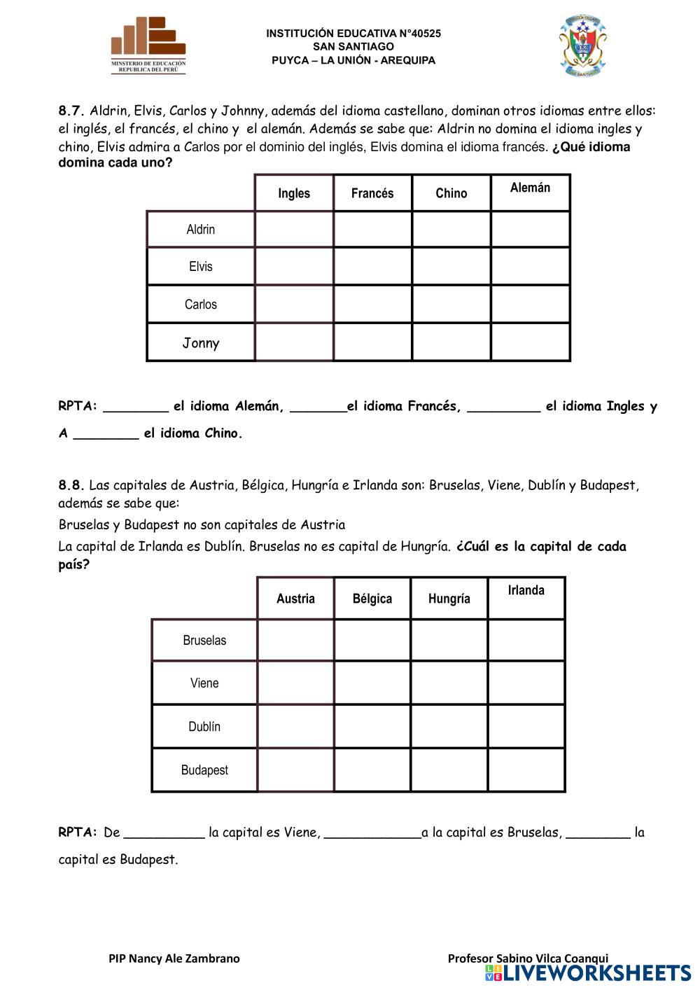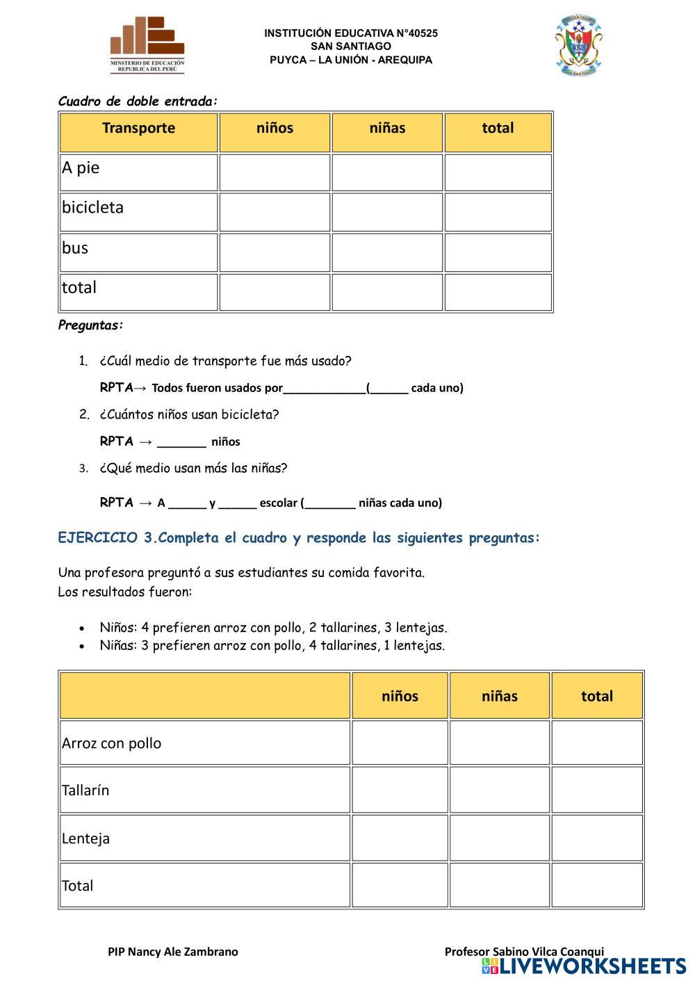 Created by Nancy_ale Matemáticas Tablas de doble entrada Age 8-15 level: Quinto primaria Spanish Author's Instructions My Google Classroom Courses × 0 classes selected (0 students total) Quick Access Select all classes (0 classes) All Classes Loading courses... Cancel Share Share to selected Course __COURSE_NAME__ __STUDENT_NAME__ (__STUDENT_EMAIL__) cuadros de doble entrada 5°B Download Worksheet Validation Check my answers Emails my answers to my teacher Full name Group/level School subject Teacher's email or key code Close Submit Validating worksheet... (12) Your answers have been sent to your teacher. Good luck! OK We encountered an error submitting your answers. Please try again. OK Advertisement | Go Ad Free Created by Nancy_ale Matemáticas Tablas de doble entrada Age 8-15 level: Quinto primaria Spanish Author's Instructions