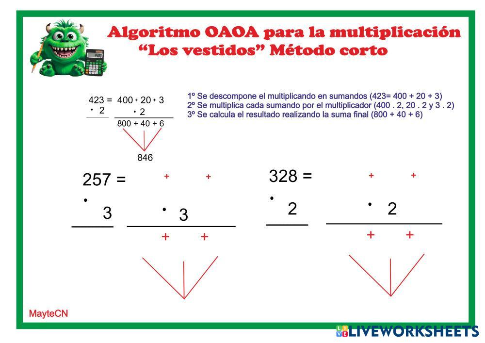 Created byLuz Mayte Correa Nazco Matemáticas Multiplicaciones Age 7-15 level: 3º Spanish Author's Instructions My Google Classroom Courses × 0 classes selected (0 students total) Quick Access Select all classes (0 classes) All Classes Loading courses... Cancel Share Share to selected Course __COURSE_NAME__ __STUDENT_NAME__ (__STUDENT_EMAIL__) Multiplicar con el algoritmo de "los vestidos". Método corto. Download Worksheet Validation Check my answers Emails my answers to my teacher Full name Group/level School subject Teacher's email or key code Close Submit Validating worksheet... (12) Your answers have been sent to your teacher. Good luck! OK We encountered an error submitting your answers. Please try again. OK Advertisement | Go Ad Free Created byLuz Mayte Correa Nazco Matemáticas Multiplicaciones Age 7-15 level: 3º Spanish Author's Instructions