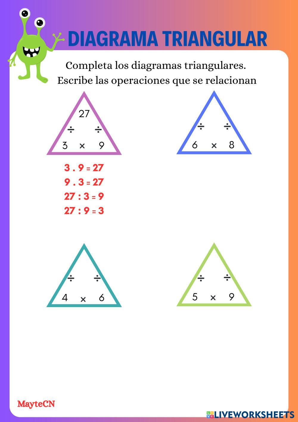Created byLuz Mayte Correa Nazco Matemáticas Tablas de multiplicar. Age 7-15 level: 3º Spanish Author's Instructions My Google Classroom Courses × 0 classes selected (0 students total) Quick Access Select all classes (0 classes) All Classes Loading courses... Cancel Share Share to selected Course __COURSE_NAME__ __STUDENT_NAME__ (__STUDENT_EMAIL__) Completa los diagramas triangulares. Relaciona la multiplicación y la división Download Worksheet Validation Check my answers Emails my answers to my teacher Full name Group/level School subject Teacher's email or key code Close Submit Validating worksheet... (12) Your answers have been sent to your teacher. Good luck! OK We encountered an error submitting your answers. Please try again. OK Advertisement | Go Ad Free Created byLuz Mayte Correa Nazco Matemáticas Tablas de multiplicar. Age 7-15 level: 3º Spanish Author's Instructions