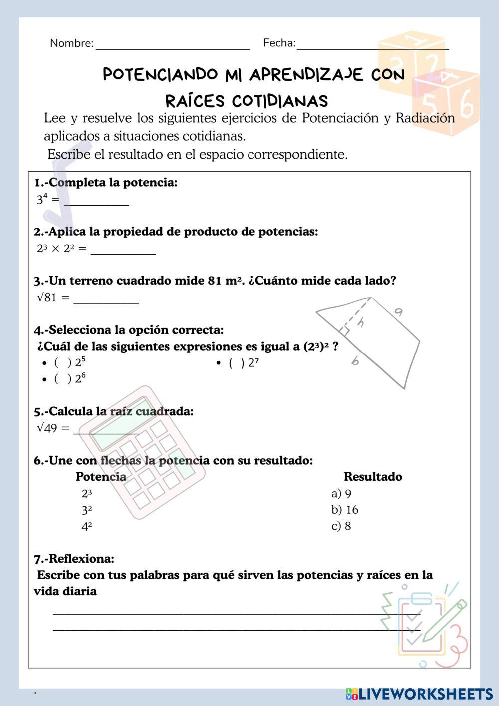 Recuerda aplicar las propiedades de las potencias y raíces para resolver los ejercicios.