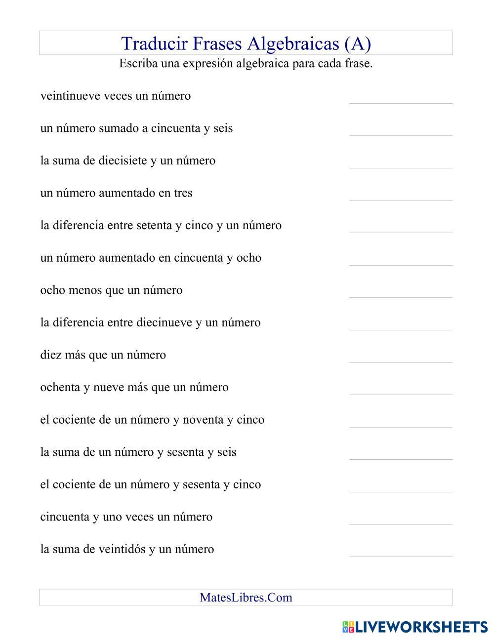 TRADUCE LAS EXPRESIONES ALGEBRAICAS A LENGUAJE NUMÉRICO