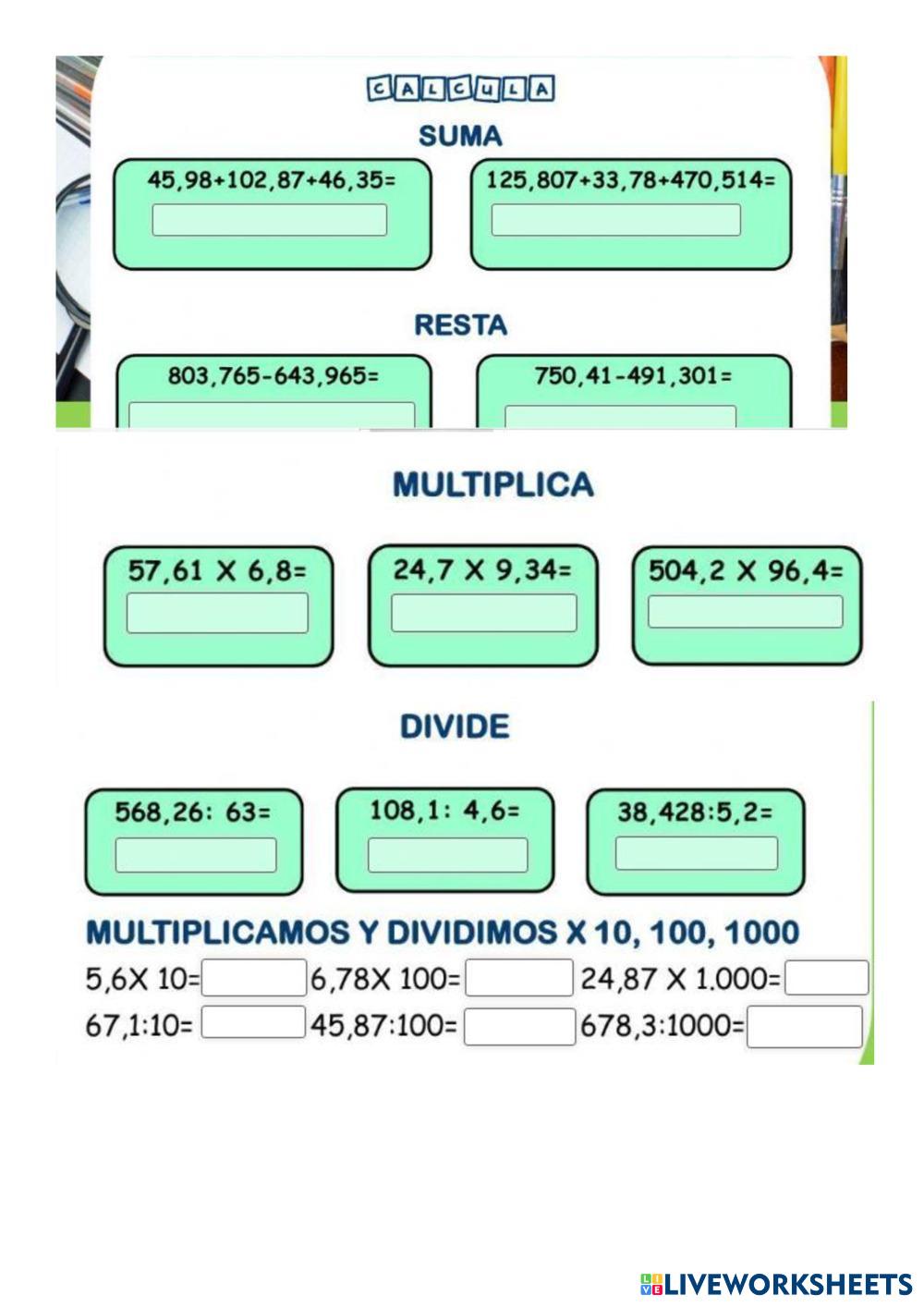 REALIZA LAS SIGUIENTES OPERACIONES MATEMATICAS CON NUMEROS DECIMALES.