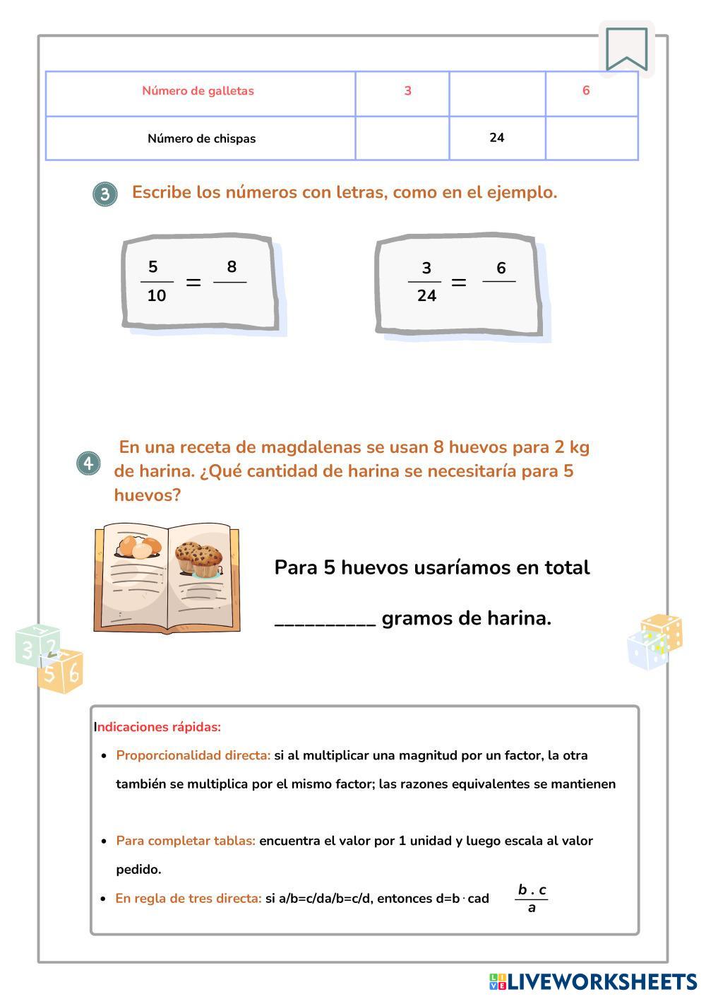 Lee cada ejercicio y analiza si las magnitudes son proporcionales, justificando tus respuestas con cálculos. Completa las tablas aplicando la proporcionalidad directa y usa la regla de tres para hallar los valores faltantes. Revisa tus resultados antes de continuar.