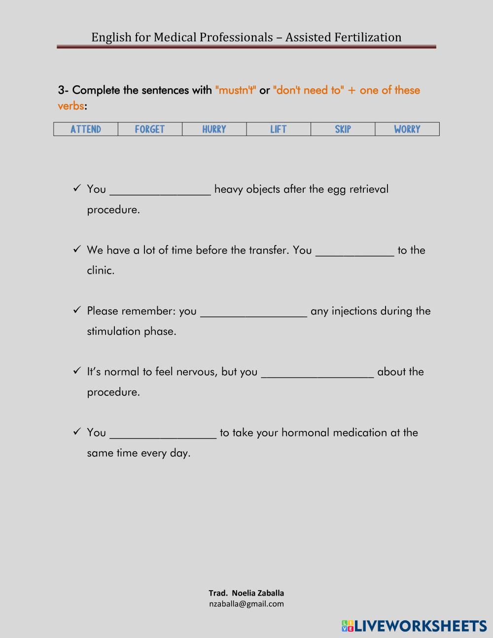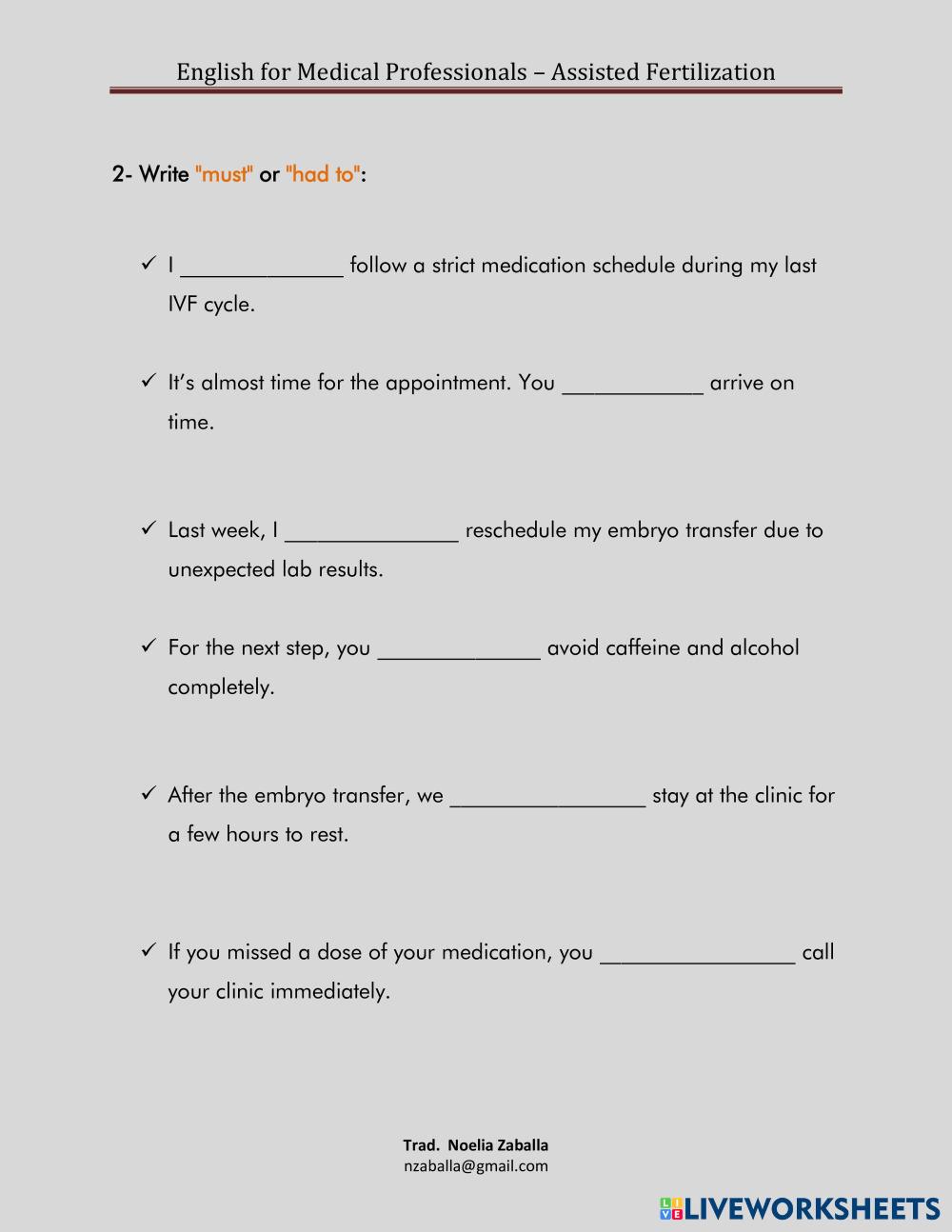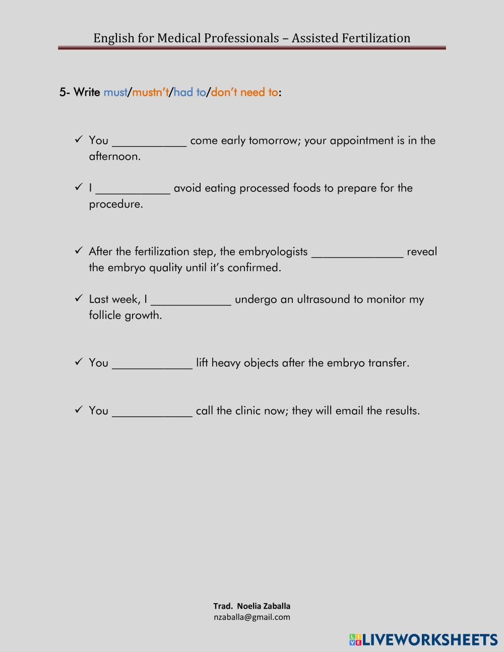 Created byNoelia Medical English Modals Age 18+ level: B1+ Spanish Author's Instructions My Google Classroom Courses × 0 classes selected (0 students total) Quick Access Select all classes (0 classes) All Classes Loading courses... Cancel Share Share to selected Course __COURSE_NAME__ __STUDENT_NAME__ (__STUDENT_EMAIL__) Must - Mustn't - Have To Download Worksheet Validation Check my answers Emails my answers to my teacher Full name Group/level School subject Teacher's email or key code Close Submit Validating worksheet... (12) Your answers have been sent to your teacher. Good luck! OK We encountered an error submitting your answers. Please try again. OK Advertisement | Go Ad Free Created byNoelia Medical English Modals Age 18+ level: B1+ Spanish Author's Instructions