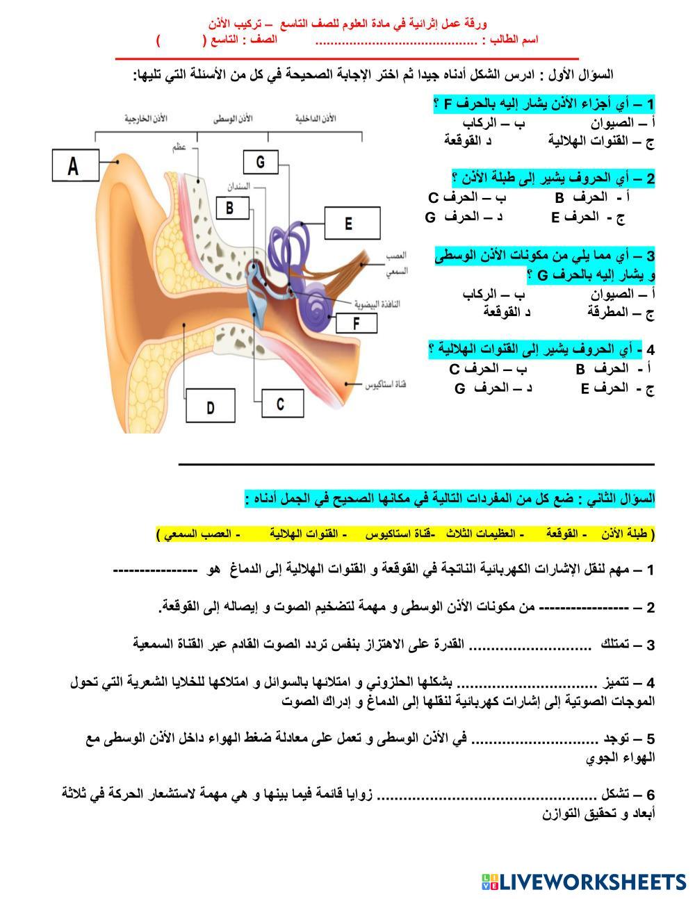 Created byabdallah shnaiwer EAR EAR STRUCTURE Age 10+ level: 9 Arabic Author's Instructions My Google Classroom Courses × 0 classes selected (0 students total) Quick Access Select all classes (0 classes) All Classes Loading courses... Cancel Share Share to selected Course __COURSE_NAME__ __STUDENT_NAME__ (__STUDENT_EMAIL__) وظائف الأذن و تركيبها Download Worksheet Validation Check my answers Emails my answers to my teacher Full name Group/level School subject Teacher's email or key code Close Submit Validating worksheet... (12) Your answers have been sent to your teacher. Good luck! OK We encountered an error submitting your answers. Please try again. OK Advertisement | Go Ad Free Created byabdallah shnaiwer EAR EAR STRUCTURE Age 10+ level: 9 Arabic Author's Instructions