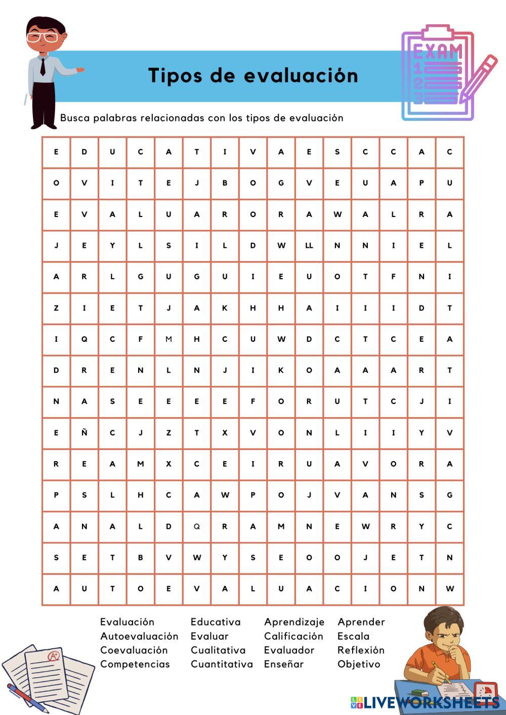 Created byDavid Mesa Pedagogía examen Age 18+ level: universidad Spanish Author's Instructions Resuelva la siguiente sopa de letras My Google Classroom Courses × 0 classes selected (0 students total) Quick Access Select all classes (0 classes) All Classes Loading courses... Cancel Share Share to selected Course __COURSE_NAME__ __STUDENT_NAME__ (__STUDENT_EMAIL__) Sopa de letra tipos de evaluacion Download Worksheet Validation Check my answers Emails my answers to my teacher Full name Group/level School subject Teacher's email or key code Close Submit Validating worksheet... (12) Your answers have been sent to your teacher. Good luck! OK We encountered an error submitting your answers. Please try again. OK Advertisement | Go Ad Free Created byDavid Mesa Pedagogía examen Age 18+ level: universidad Spanish Author's Instructions Resuelva la siguiente sopa de letras