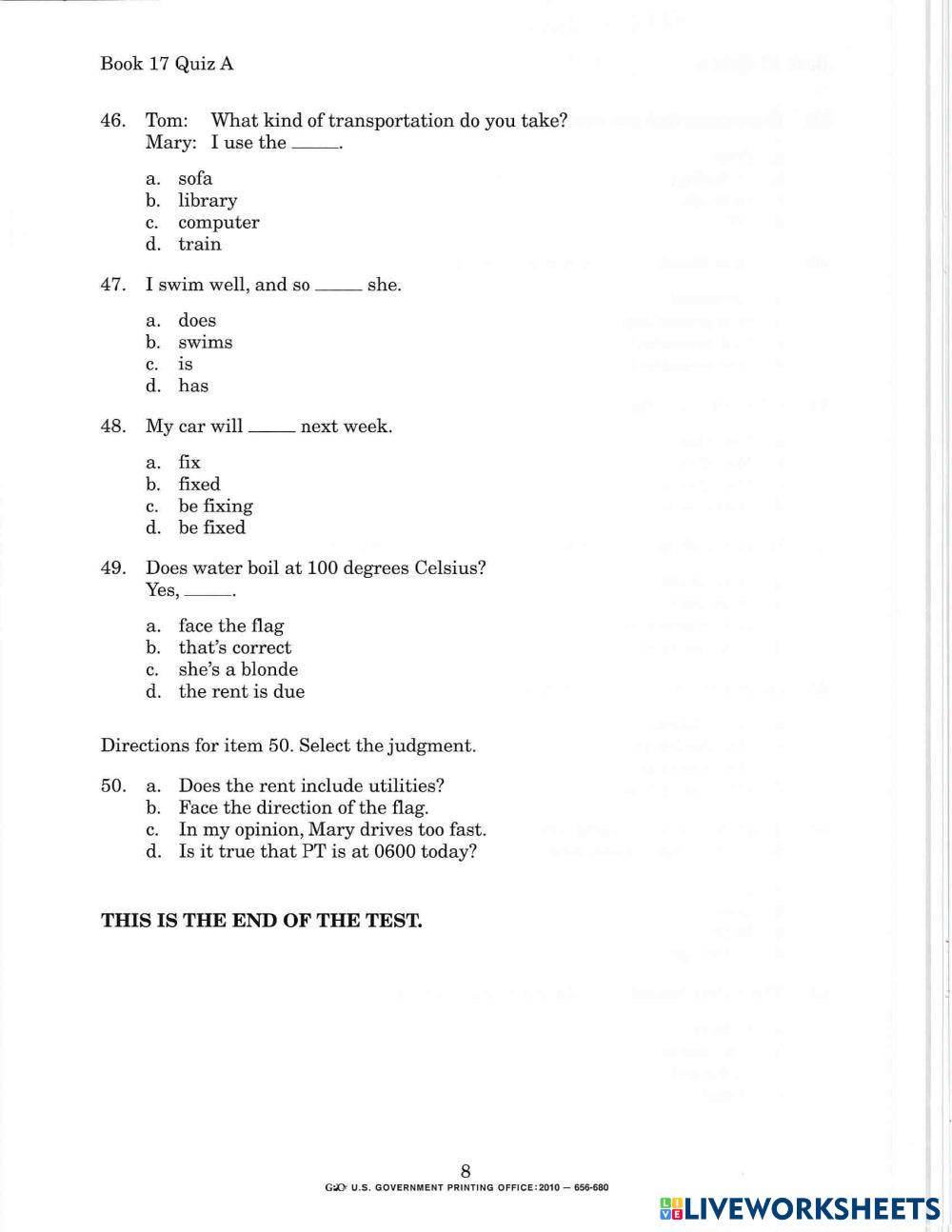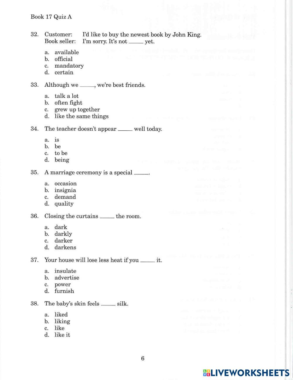 Created by CIFUX Practica Liveworksheets QUIZ 17A Age 18+ level: 17 Spanish Author's Instructions My Google Classroom Courses × 0 classes selected (0 students total) Quick Access Select all classes (0 classes) All Classes Loading courses... Cancel Share Share to selected Course __COURSE_NAME__ __STUDENT_NAME__ (__STUDENT_EMAIL__) ALC BOOK 17 Download Worksheet Validation Check my answers Emails my answers to my teacher Full name Group/level School subject Teacher's email or key code Close Submit Validating worksheet... (12) Your answers have been sent to your teacher. Good luck! OK We encountered an error submitting your answers. Please try again. OK Advertisement | Go Ad Free Created by CIFUX Practica Liveworksheets QUIZ 17A Age 18+ level: 17 Spanish Author's Instructions