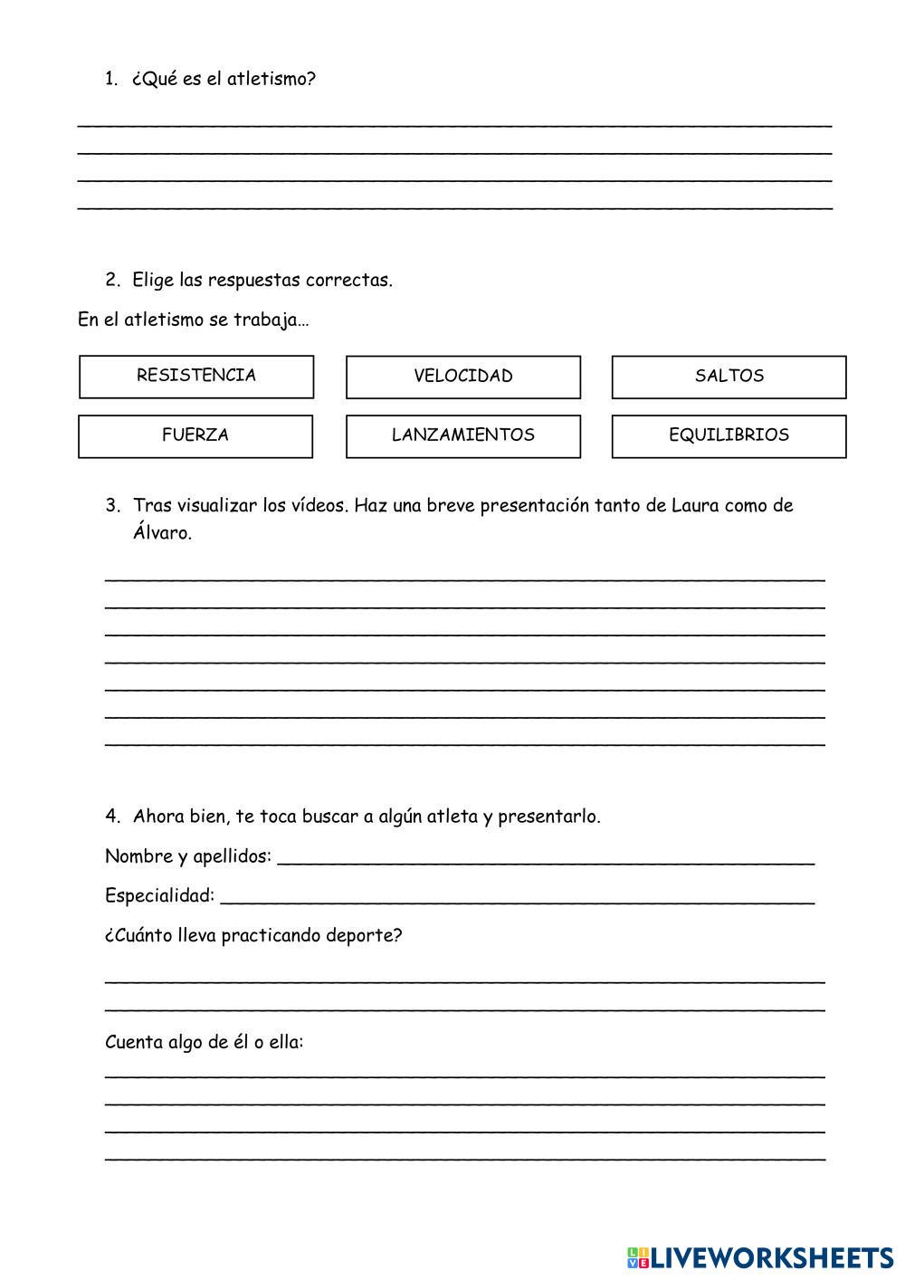 Created byRocio galiano primaria (926365) Age 12-18 level: 6 Spanish Author's Instructions My Google Classroom Courses × 0 classes selected (0 students total) Quick Access Select all classes (0 classes) All Classes Loading courses... Cancel Share Share to selected Course __COURSE_NAME__ __STUDENT_NAME__ (__STUDENT_EMAIL__) Atletismo Download Worksheet Validation Check my answers Emails my answers to my teacher Full name Group/level School subject Teacher's email or key code Close Submit Validating worksheet... (12) Your answers have been sent to your teacher. Good luck! OK We encountered an error submitting your answers. Please try again. OK Advertisement | Go Ad Free Created byRocio galiano primaria (926365) Age 12-18 level: 6 Spanish Author's Instructions