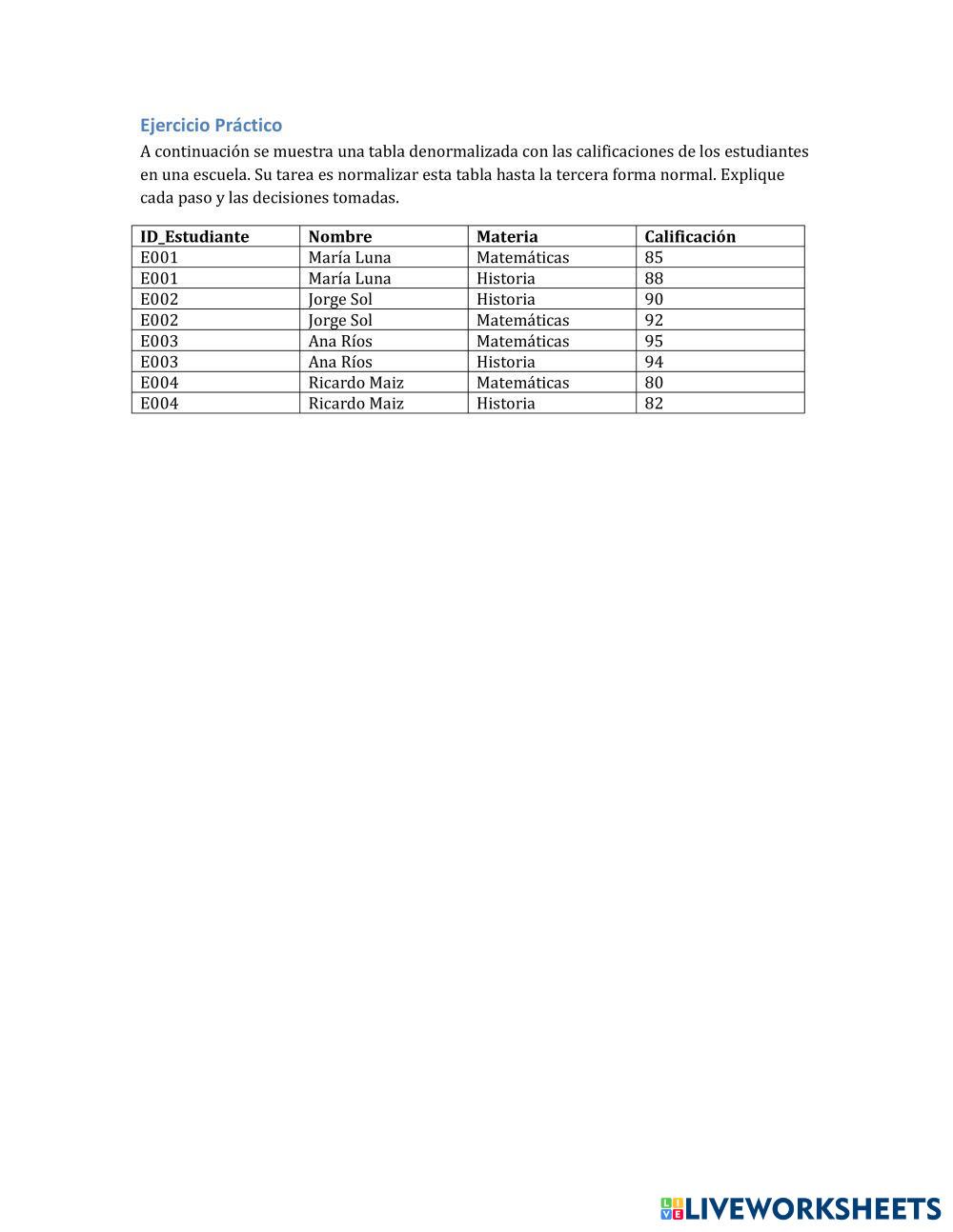Created byDiego Gantiva Programación y base de datos normalizacion de tablas Age 18+ level: técnico Spanish Author's Instructions My Google Classroom Courses × 0 classes selected (0 students total) Quick Access Select all classes (0 classes) All Classes Loading courses... Cancel Share Share to selected Course __COURSE_NAME__ __STUDENT_NAME__ (__STUDENT_EMAIL__) normalización Download Worksheet Validation Check my answers Emails my answers to my teacher Full name Group/level School subject Teacher's email or key code Close Submit Validating worksheet... (12) Your answers have been sent to your teacher. Good luck! OK We encountered an error submitting your answers. Please try again. OK Advertisement | Go Ad Free Created byDiego Gantiva Programación y base de datos normalizacion de tablas Age 18+ level: técnico Spanish Author's Instructions