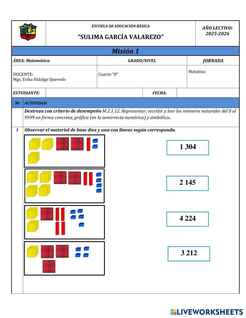 Created byErika Hidalgo Relaciones lógico-matemáticas Unidad de mil Age 8-12 level: cuarto grado Spanish Author's Instructions My Google Classroom Courses × 0 classes selected (0 students total) Quick Access Select all classes (0 classes) All Classes Loading courses... Cancel Share Share to selected Course __COURSE_NAME__ __STUDENT_NAME__ (__STUDENT_EMAIL__) Unidad de Mil Download Worksheet Validation Check my answers Emails my answers to my teacher Full name Group/level School subject Teacher's email or key code Close Submit Validating worksheet... (12) Your answers have been sent to your teacher. Good luck! OK We encountered an error submitting your answers. Please try again. OK Advertisement | Go Ad Free Created byErika Hidalgo Relaciones lógico-matemáticas Unidad de mil Age 8-12 level: cuarto grado Spanish Author's Instructions