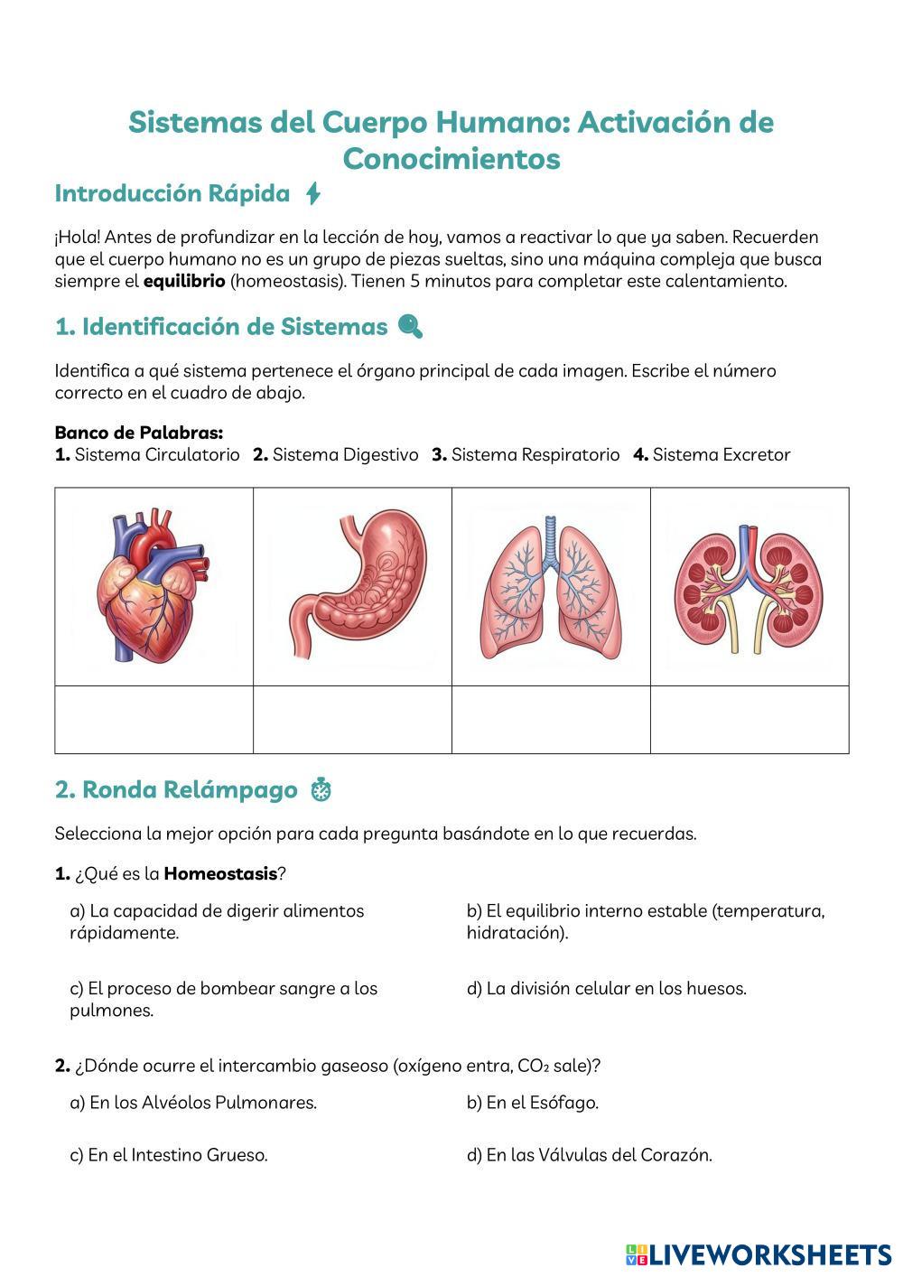 Created byEgenory Barrantes Cubero Science High School 9th grade Biology Spanish Author's Instructions Completar diagnostico My Google Classroom Courses × 0 classes selected (0 students total) Quick Access Select all classes (0 classes) All Classes Loading courses... Cancel Share Share to selected Course __COURSE_NAME__ __STUDENT_NAME__ (__STUDENT_EMAIL__) Sistemas del Cuerpo Humano Download Worksheet Validation Check my answers Emails my answers to my teacher Full name Group/level School subject Teacher's email or key code Close Submit Validating worksheet... (12) Your answers have been sent to your teacher. Good luck! OK We encountered an error submitting your answers. Please try again. OK Advertisement | Go Ad Free Created byEgenory Barrantes Cubero Science High School 9th grade Biology Spanish Author's Instructions Completar diagnostico Explore Worksheets مقارنة بين الانقسام المتساوي والمنصف Science 9th grade مقارنة بين الانقسام المتساوي والمنصف Biology - Science قارن بين الانقسام المتساوي والانقسام المنصف science Science 9th grade science Biology - Science solve APARATO DIGESTIVO (1) Science 9th grade APARATO DIGESTIVO (1) Biology - Science Completa. Orgánulos celulares Science 9th grade Orgánulos celulares Biology - Science Selecciona el orgánulo con la función celular.