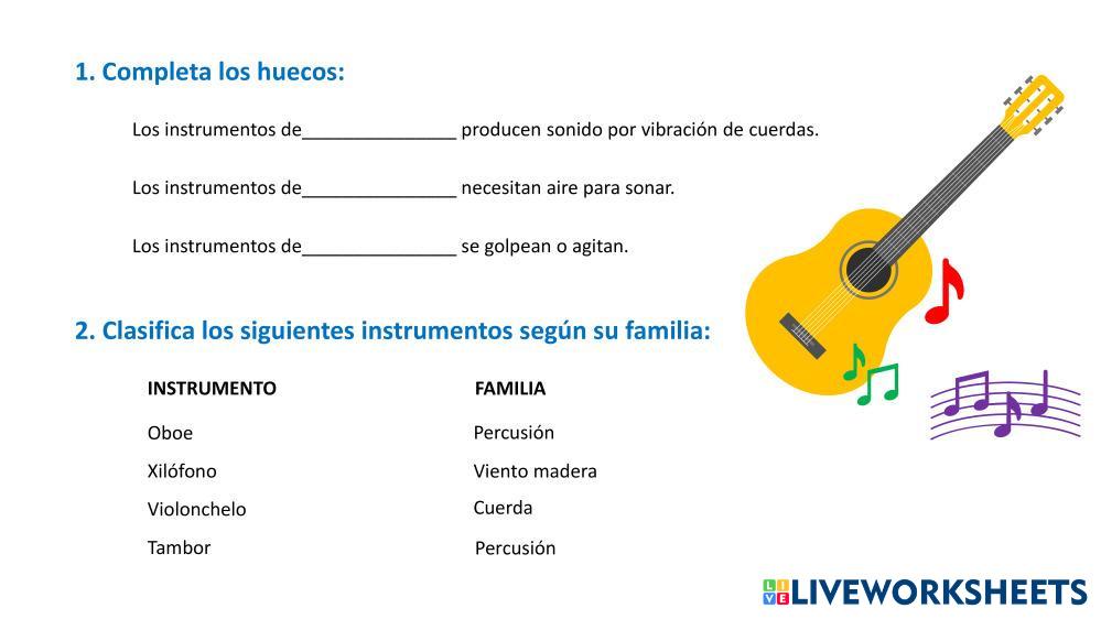 Lee las preguntas y completa los espacios. Después clasifica los instrumentos según su familia.