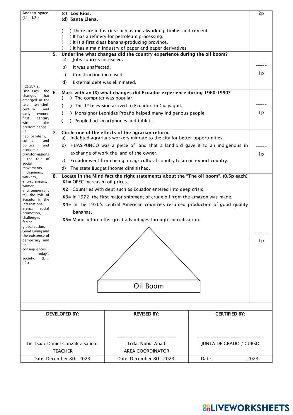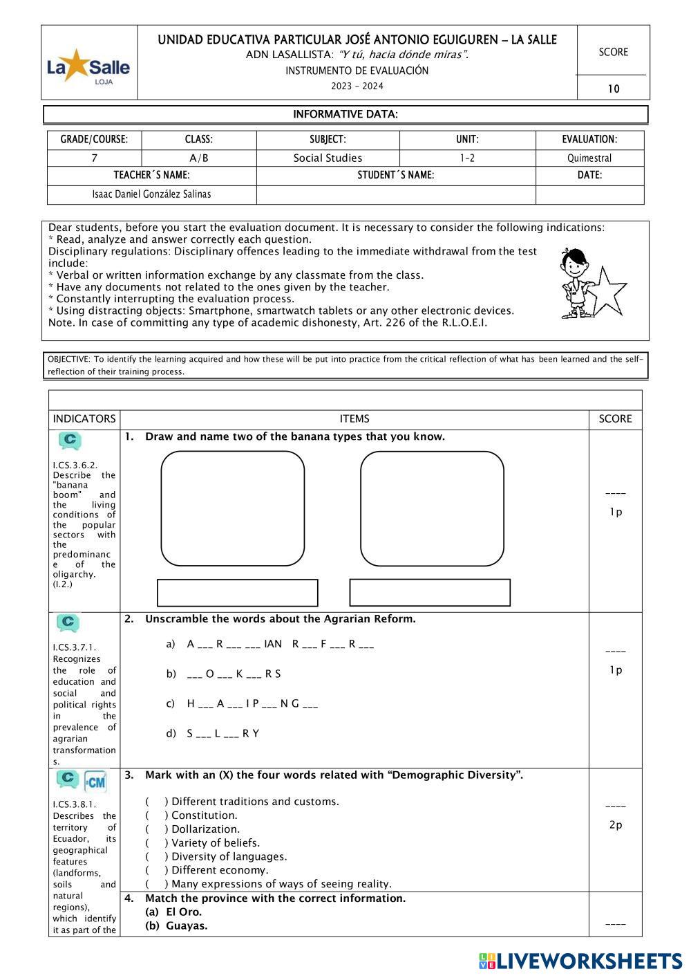 Created byjose chamba Social Studies PRUEBA QUIMESTRAL Age 10-16 level: 7MO Spanish Author's Instructions ANSWER THE QUESTIONS My Google Classroom Courses × 0 classes selected (0 students total) Quick Access Select all classes (0 classes) All Classes Loading courses... Cancel Share Share to selected Course __COURSE_NAME__ __STUDENT_NAME__ (__STUDENT_EMAIL__) PRUEBA QUIMESTRAL 7MO A Download Worksheet Validation Check my answers Emails my answers to my teacher Full name Group/level School subject Teacher's email or key code Close Submit Validating worksheet... (12) Your answers have been sent to your teacher. Good luck! OK We encountered an error submitting your answers. Please try again. OK Advertisement | Go Ad Free Created byjose chamba Social Studies PRUEBA QUIMESTRAL Age 10-16 level: 7MO Spanish Author's Instructions ANSWER THE QUESTIONS