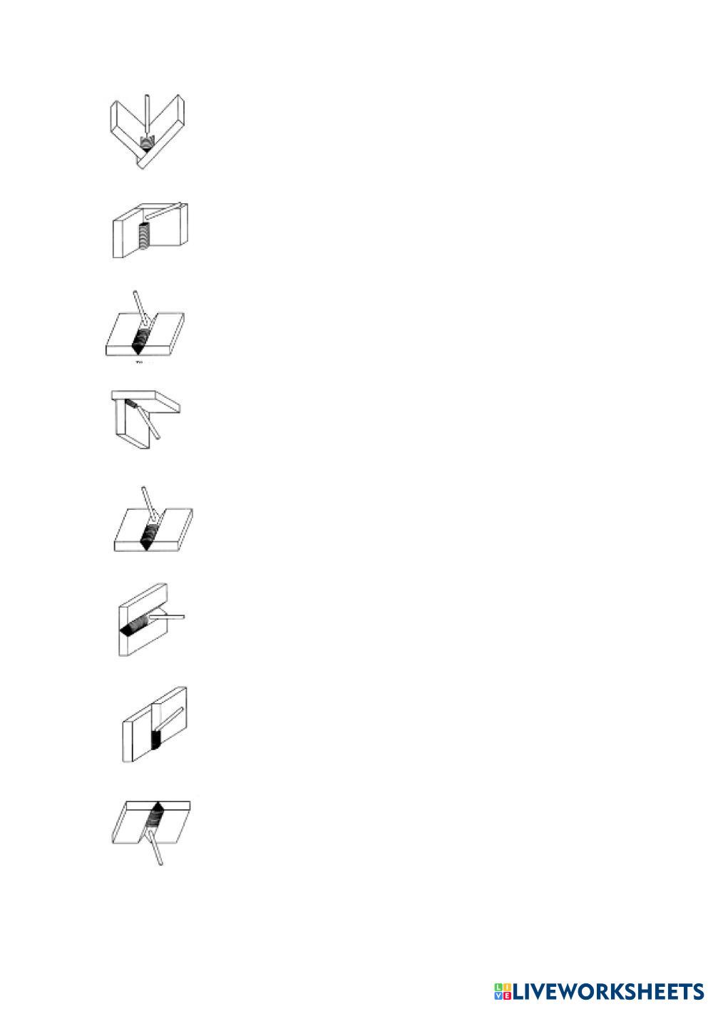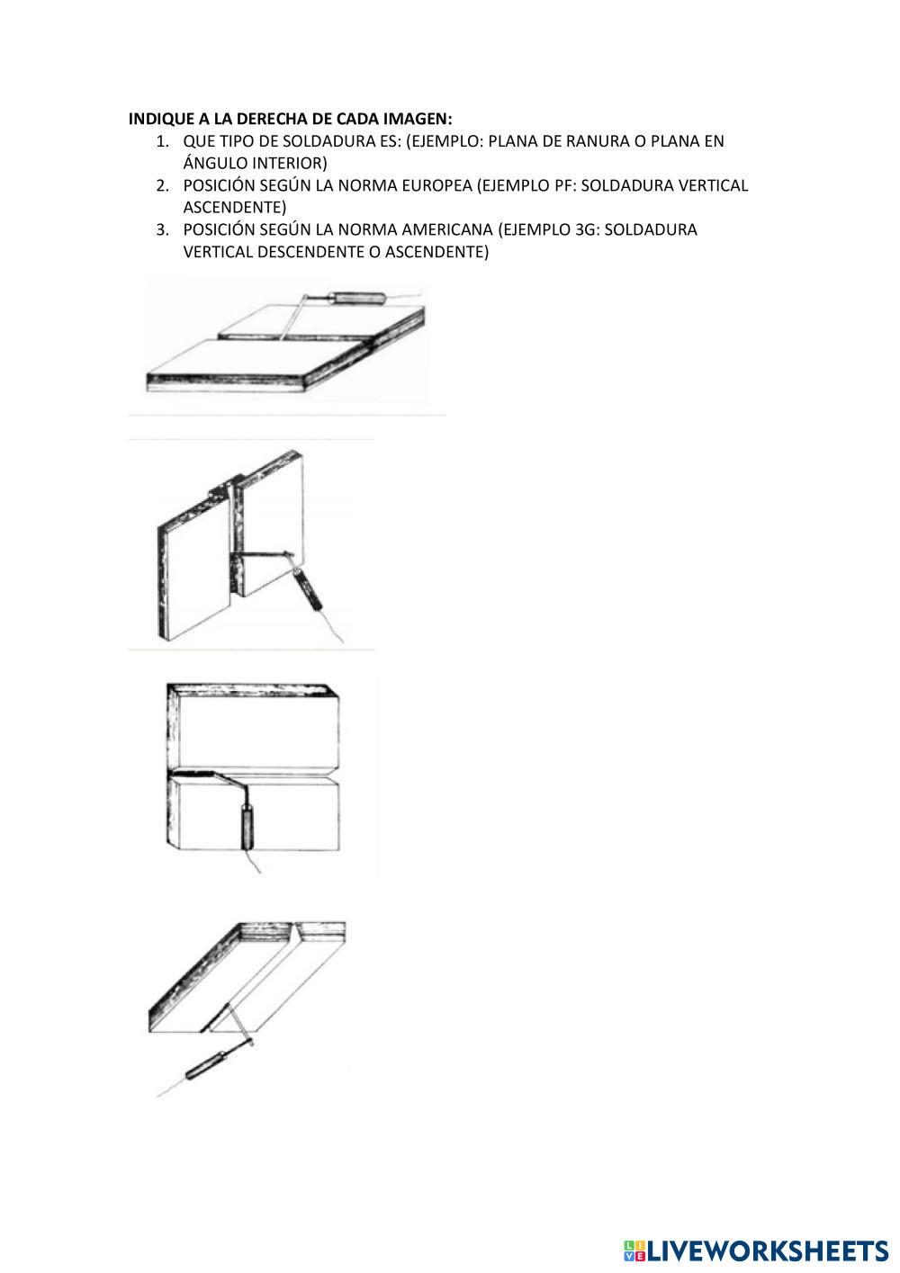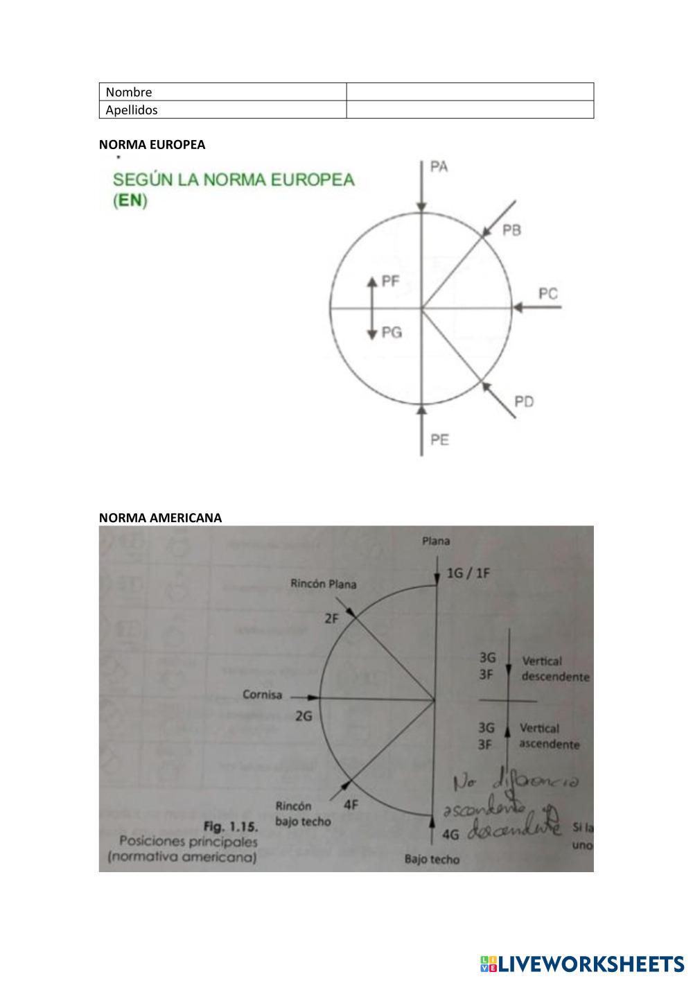 En este ejercicio se propone al estudiante la selección de la nomenclatura asociada a las posiciones de soldadura según la norma europea y americana para unas imágenes dadas.