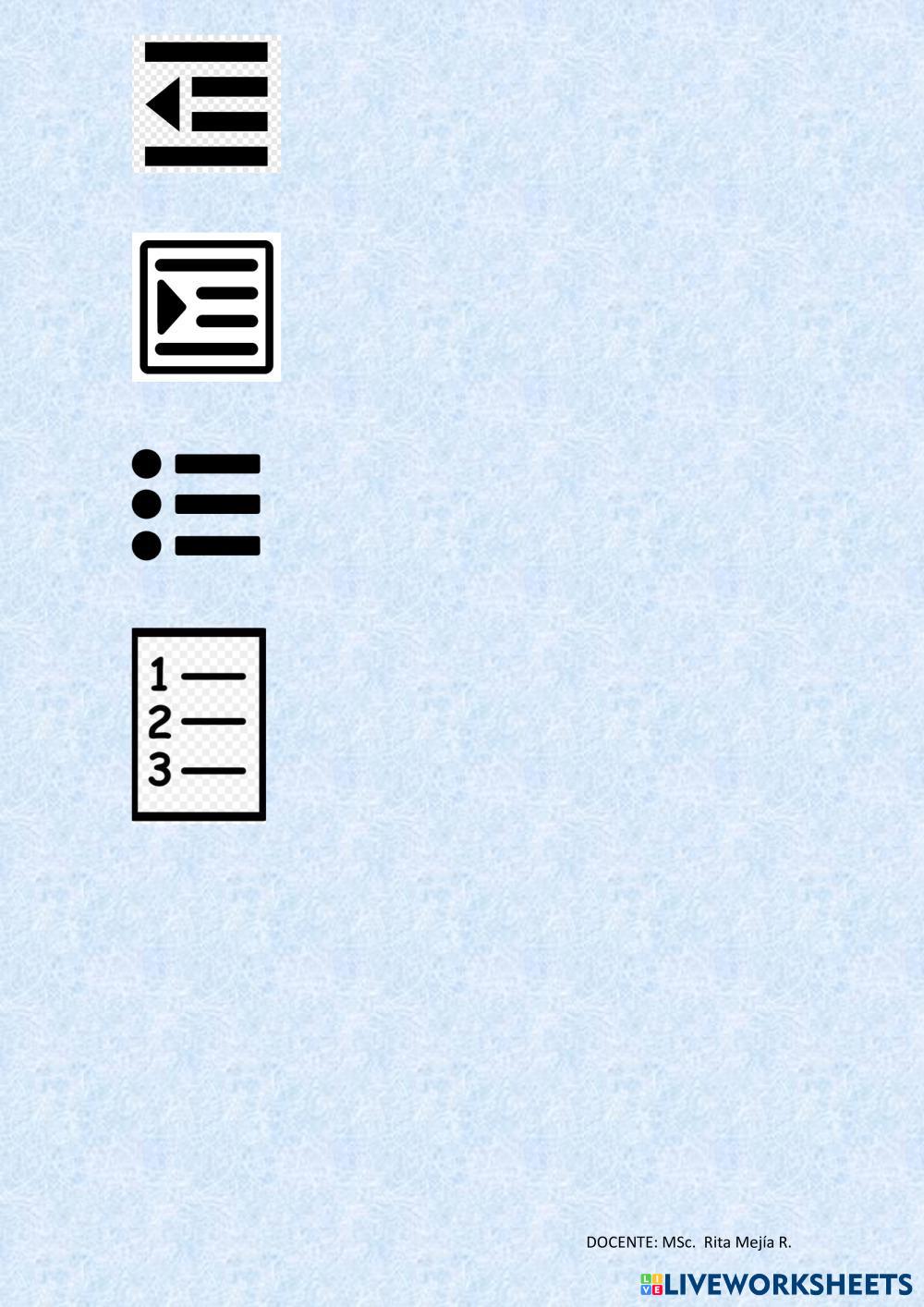 Created byRita Ramírez TECNOLOGÍA Practica Age 4-12 level: 4 Spanish Author's Instructions My Google Classroom Courses × 0 classes selected (0 students total) Quick Access Select all classes (0 classes) All Classes Loading courses... Cancel Share Share to selected Course __COURSE_NAME__ __STUDENT_NAME__ (__STUDENT_EMAIL__) DEBER DIGITAL ÍCONOS DE FORMATO AL TEXTO Y FORMATO A PÁRRAFO DE WORD Download Worksheet Validation Check my answers Emails my answers to my teacher Full name Group/level School subject Teacher's email or key code Close Submit Validating worksheet... (12) Your answers have been sent to your teacher. Good luck! OK We encountered an error submitting your answers. Please try again. OK Advertisement | Go Ad Free Created byRita Ramírez TECNOLOGÍA Practica Age 4-12 level: 4 Spanish Author's Instructions