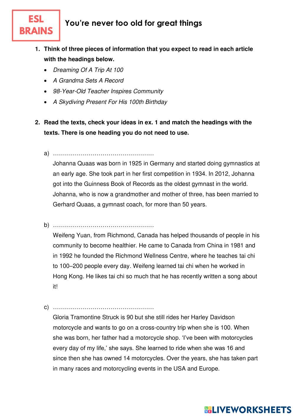 At the beginning of the lesson, students read four headings and think what they have in common. Students also say whether they agree with the title of the lesson. Then, they predict what information they might find in each of the articles. After that, students read three texts and match the headings with the texts. Then, they read the texts again and decide whether some statements are true or false. Next, students read four rules about Present Perfect and Past Simple and match them with the correct sentences from the texts. The teacher can also elicit adverbs and time expressions for Present Perfect and Past Simple. Finally, students discuss the stories they read and talk about the elderly people they know.