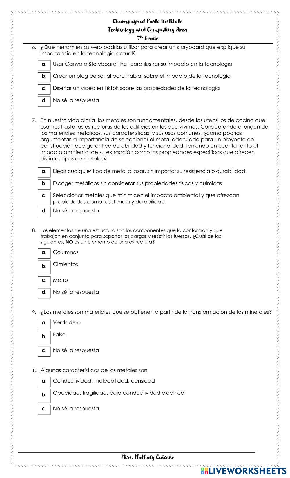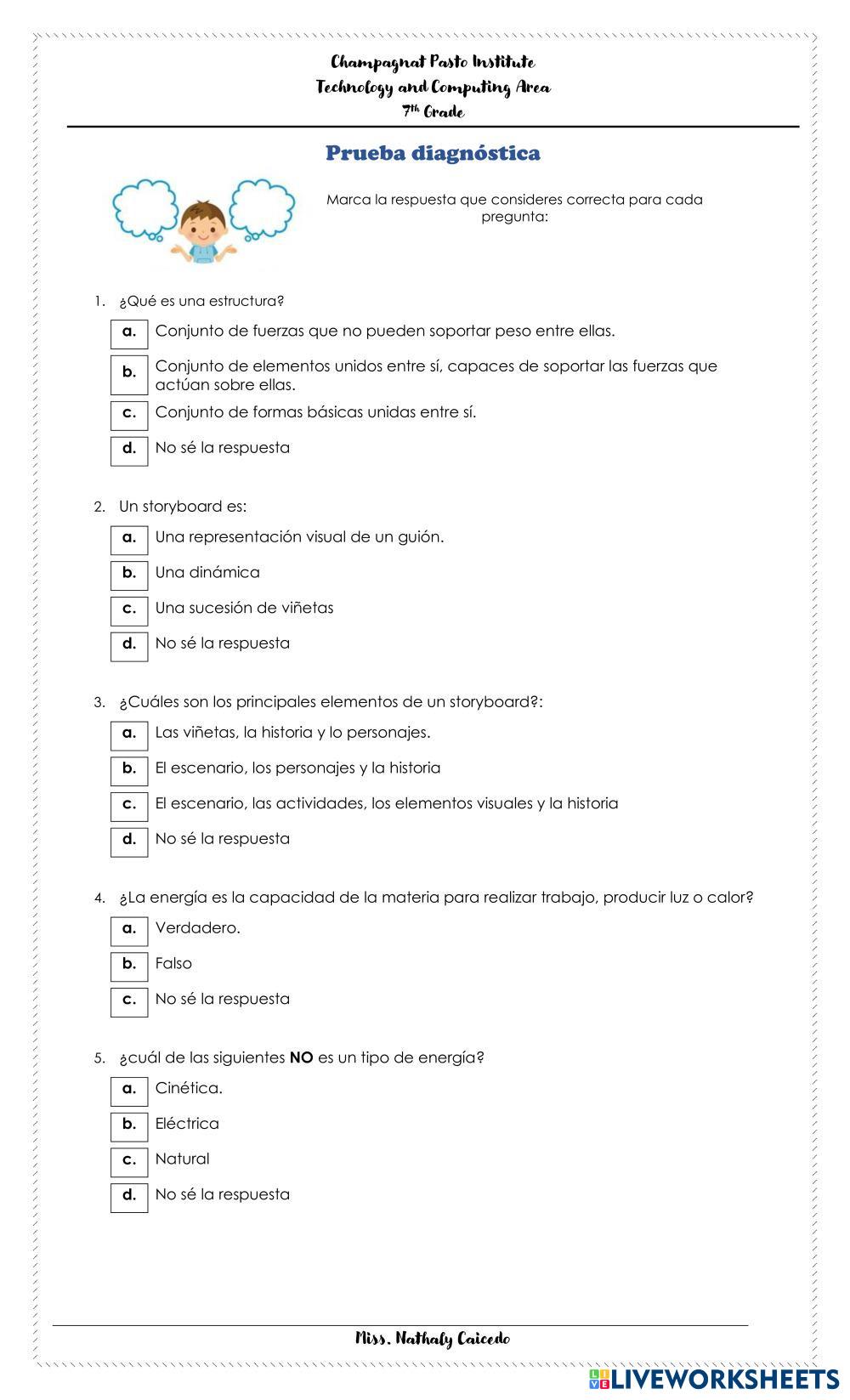 Created byNATHALY ALEXANDRA CAICEDO Tecnología Tecnología, información e innovación Age 11-16 level: 7 Spanish Author's Instructions My Google Classroom Courses × 0 classes selected (0 students total) Quick Access Select all classes (0 classes) All Classes Loading courses... Cancel Share Share to selected Course __COURSE_NAME__ __STUDENT_NAME__ (__STUDENT_EMAIL__) PRUEBA DIAGNOSTICA Download Worksheet Validation Check my answers Emails my answers to my teacher Full name Group/level School subject Teacher's email or key code Close Submit Validating worksheet... (12) Your answers have been sent to your teacher. Good luck! OK We encountered an error submitting your answers. Please try again. OK Advertisement | Go Ad Free Created byNATHALY ALEXANDRA CAICEDO Tecnología Tecnología, información e innovación Age 11-16 level: 7 Spanish Author's Instructions