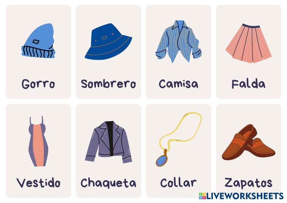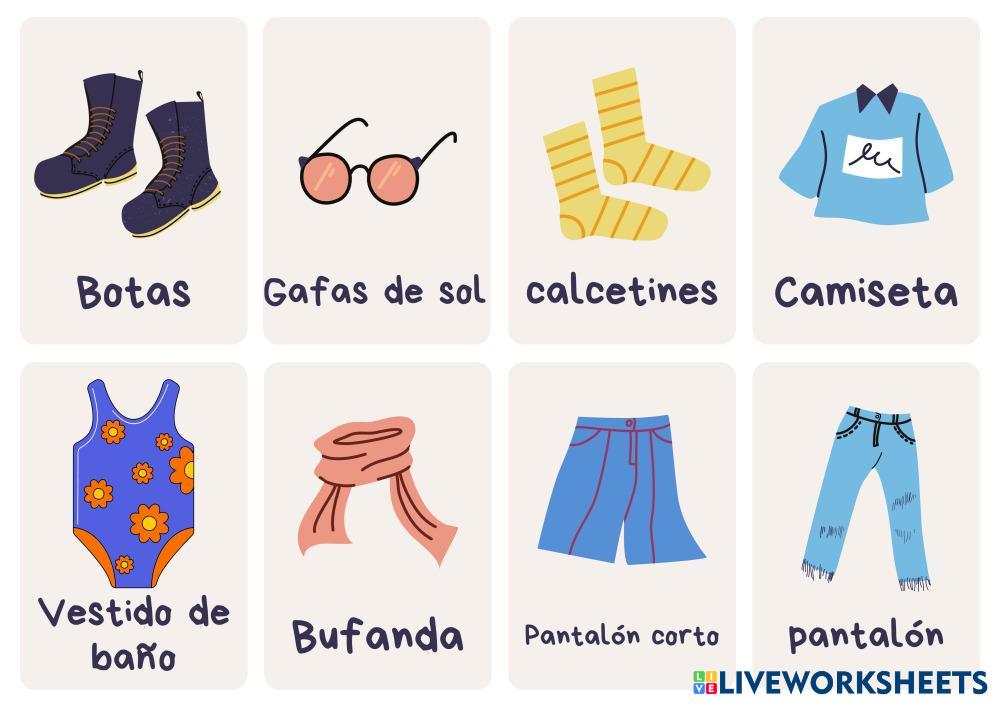 Created byAlejandro Beltran Vocabulario Prendas de vestir Age 6-17 level: 3 Spanish Author's Instructions My Google Classroom Courses × 0 classes selected (0 students total) Quick Access Select all classes (0 classes) All Classes Loading courses... Cancel Share Share to selected Course __COURSE_NAME__ __STUDENT_NAME__ (__STUDENT_EMAIL__) Prendas de vestir Download Worksheet Validation Check my answers Emails my answers to my teacher Full name Group/level School subject Teacher's email or key code Close Submit Validating worksheet... (12) Your answers have been sent to your teacher. Good luck! OK We encountered an error submitting your answers. Please try again. OK Advertisement | Go Ad Free Created byAlejandro Beltran Vocabulario Prendas de vestir Age 6-17 level: 3 Spanish Author's Instructions