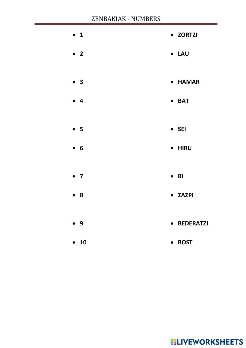 Created byElisa basque HIZTEGIA Age 6+ level: LH Basque Author's Instructions My Google Classroom Courses × 0 classes selected (0 students total) Quick Access Select all classes (0 classes) All Classes Loading courses... Cancel Share Share to selected Course __COURSE_NAME__ __STUDENT_NAME__ (__STUDENT_EMAIL__) ZENBAKIAK LOTU Download Worksheet Validation Check my answers Emails my answers to my teacher Full name Group/level School subject Teacher's email or key code Close Submit Validating worksheet... (12) Your answers have been sent to your teacher. Good luck! OK We encountered an error submitting your answers. Please try again. OK Advertisement | Go Ad Free Created byElisa basque HIZTEGIA Age 6+ level: LH Basque Author's Instructions