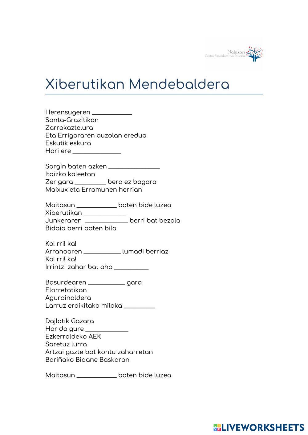 Created by marialandazuri ESL Basque A1 Vocabulary Basque Author's Instructions Osatu hutsuneak My Google Classroom Courses × 0 classes selected (0 students total) Quick Access Select all classes (0 classes) All Classes Loading courses... Cancel Share Share to selected Course __COURSE_NAME__ __STUDENT_NAME__ (__STUDENT_EMAIL__) Xiberutikan mendebaldera Download Worksheet Validation Check my answers Emails my answers to my teacher Full name Group/level School subject Teacher's email or key code Close Submit Validating worksheet... (12) Your answers have been sent to your teacher. Good luck! OK We encountered an error submitting your answers. Please try again. OK Advertisement | Go Ad Free Created by marialandazuri ESL Basque A1 Vocabulary Basque Author's Instructions Osatu hutsuneak Explore Worksheets Emozioak ESL A1 Emozioak Vocabulary - ESL Osatu hitzak emozioei izena jarrita Elkartu silabak (R) ESL A1 Elkartu silabak (R) Vocabulary - ESL Elkatu silabak hitzak osatzeko. Osatu falta den letra ESL A1 Osatu falta den letra Vocabulary - ESL Aukeratu falta den letra. Latihan ayat tanya ESL A1 Latihan ayat tanya Vocabulary - ESL Sila bina ayat tanya.