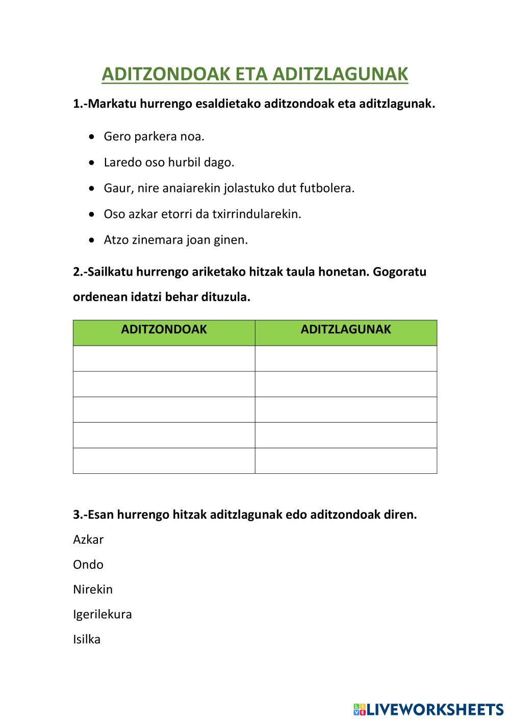 Created by LibeJM euskera aditzondoak Age 9-15 level: 5 Basque Author's Instructions My Google Classroom Courses × 0 classes selected (0 students total) Quick Access Select all classes (0 classes) All Classes Loading courses... Cancel Share Share to selected Course __COURSE_NAME__ __STUDENT_NAME__ (__STUDENT_EMAIL__) Aditzondoak eta aditzlagunak Download Worksheet Validation Check my answers Emails my answers to my teacher Full name Group/level School subject Teacher's email or key code Close Submit Validating worksheet... (12) Your answers have been sent to your teacher. Good luck! OK We encountered an error submitting your answers. Please try again. OK Advertisement | Go Ad Free Created by LibeJM euskera aditzondoak Age 9-15 level: 5 Basque Author's Instructions