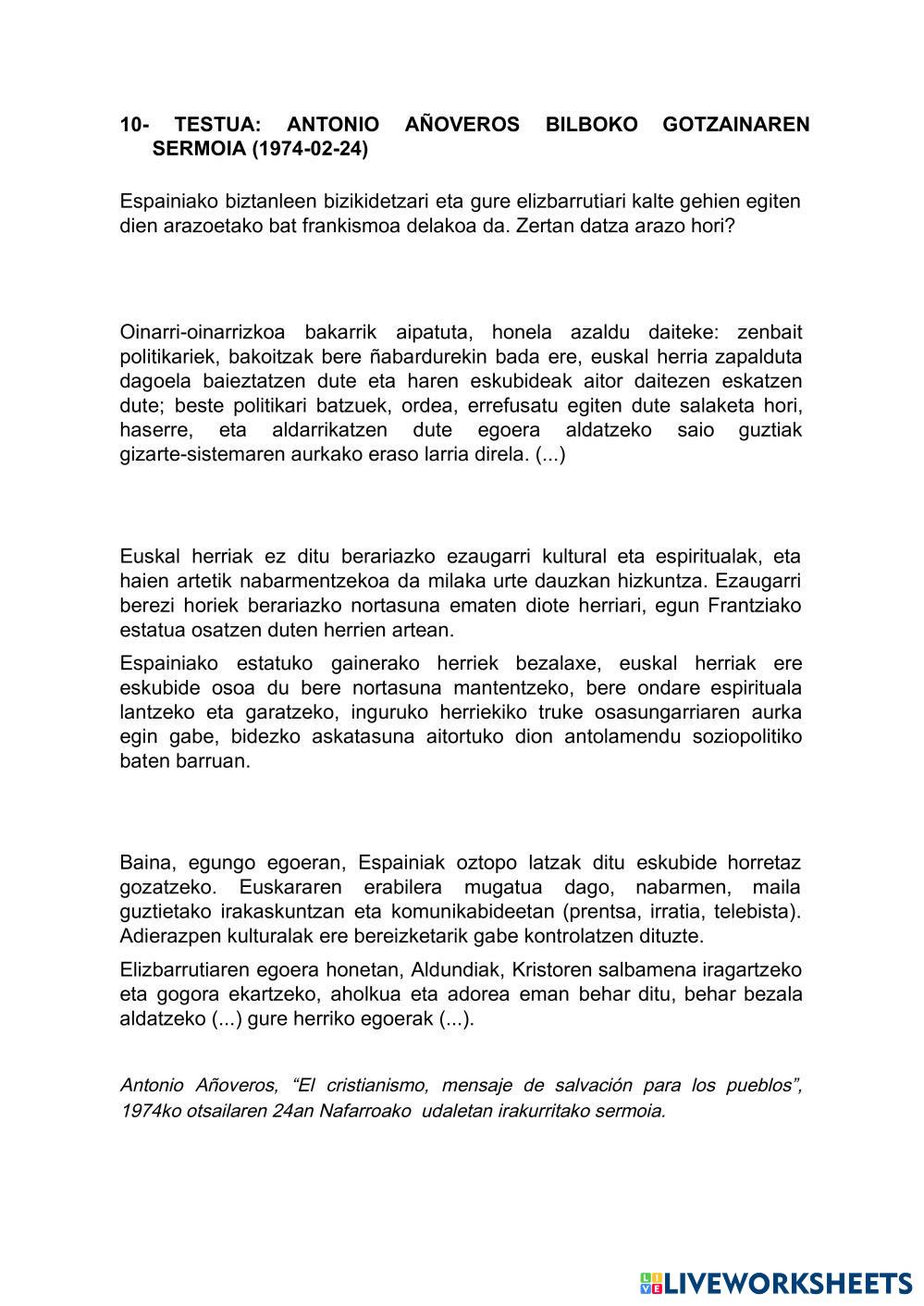 Created by etxekobai Social Studies High School 12th grade History Basque Author's Instructions zuzendu My Google Classroom Courses × 0 classes selected (0 students total) Quick Access Select all classes (0 classes) All Classes Loading courses... Cancel Share Share to selected Course __COURSE_NAME__ __STUDENT_NAME__ (__STUDENT_EMAIL__) 10. testua - Antonio Añoveros Bilboko Gotzainaren sermoia Download Worksheet Validation Check my answers Emails my answers to my teacher Full name Group/level School subject Teacher's email or key code Close Submit Validating worksheet... (12) Your answers have been sent to your teacher. Good luck! OK We encountered an error submitting your answers. Please try again. OK Advertisement | Go Ad Free Created by etxekobai Social Studies High School 12th grade History Basque Author's Instructions zuzendu Explore Worksheets 9-testua - Baionako hitzarmena Social Studies 12th grade 9-testua - Baionako hitzarmena History - Social Studies Zuzendu 8. testua - Estatuaren lege organikoa Social Studies 12th grade 8. testua - Estatuaren lege organikoa History - Social Studies Zuzendu 7. TESTUA: EUROPAR MUGIMENDUAREN KONGRESUAK Social Studies 12th grade 7. TESTUA: EUROPAR MUGIMENDUAREN KONGRESUAK History - Social Studies Zuzendu 6.- testua - Nazio - intereseko industriak babesteko legea Social Studies 12th grade 6.- testua - Nazio - intereseko industriak babesteko legea History - Social Studies zuzendu
