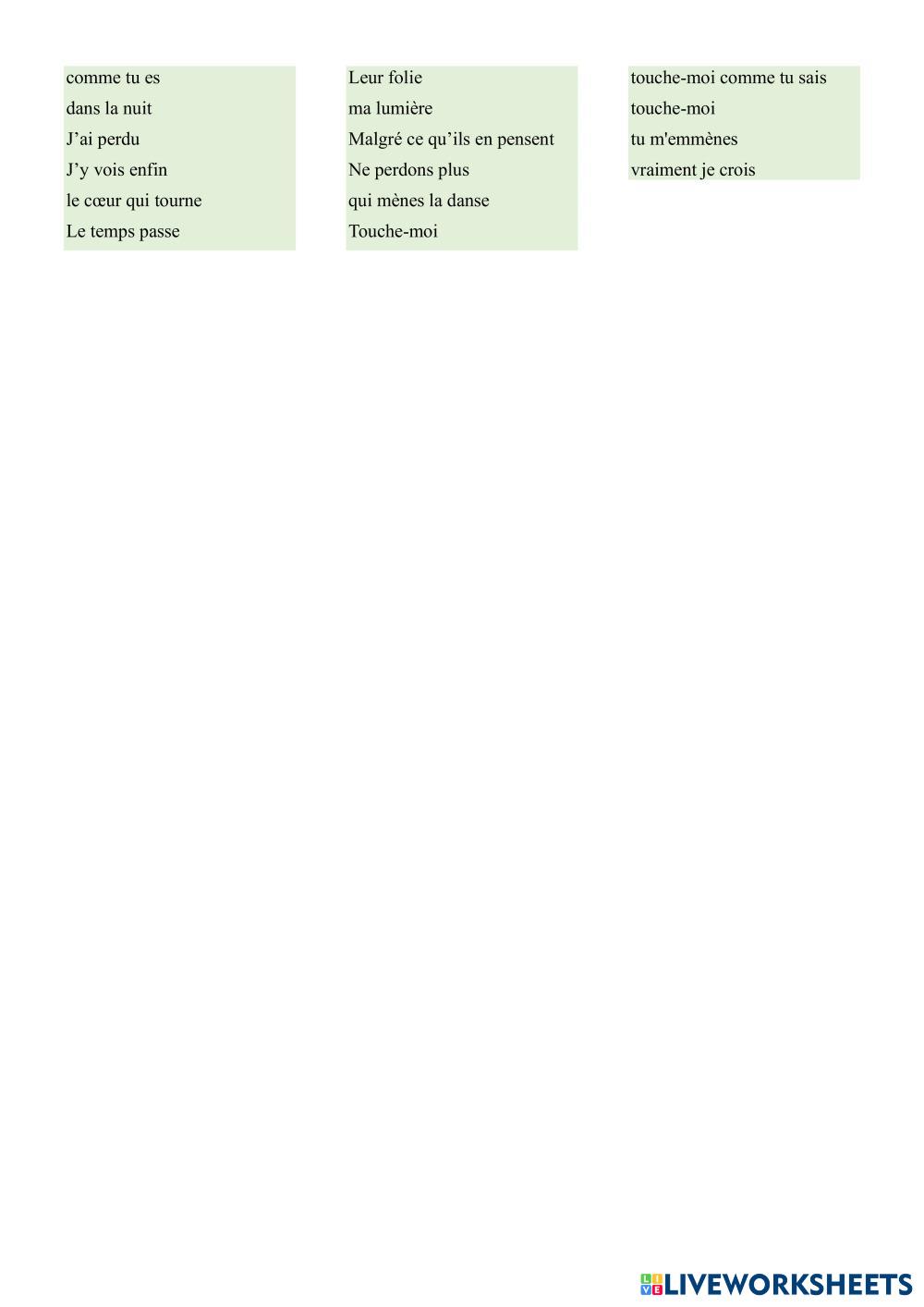 Created byGabriela chanson Vocabulaire et sons Age 13+ level: a2 French Author's Instructions My Google Classroom Courses × 0 classes selected (0 students total) Quick Access Select all classes (0 classes) All Classes Loading courses... Cancel Share Share to selected Course __COURSE_NAME__ __STUDENT_NAME__ (__STUDENT_EMAIL__) Aime-moi comme tu es Download Worksheet Validation Check my answers Emails my answers to my teacher Full name Group/level School subject Teacher's email or key code Close Submit Validating worksheet... (12) Your answers have been sent to your teacher. Good luck! OK We encountered an error submitting your answers. Please try again. OK Advertisement | Go Ad Free Created byGabriela chanson Vocabulaire et sons Age 13+ level: a2 French Author's Instructions