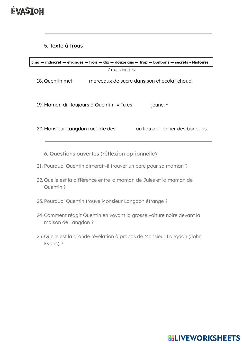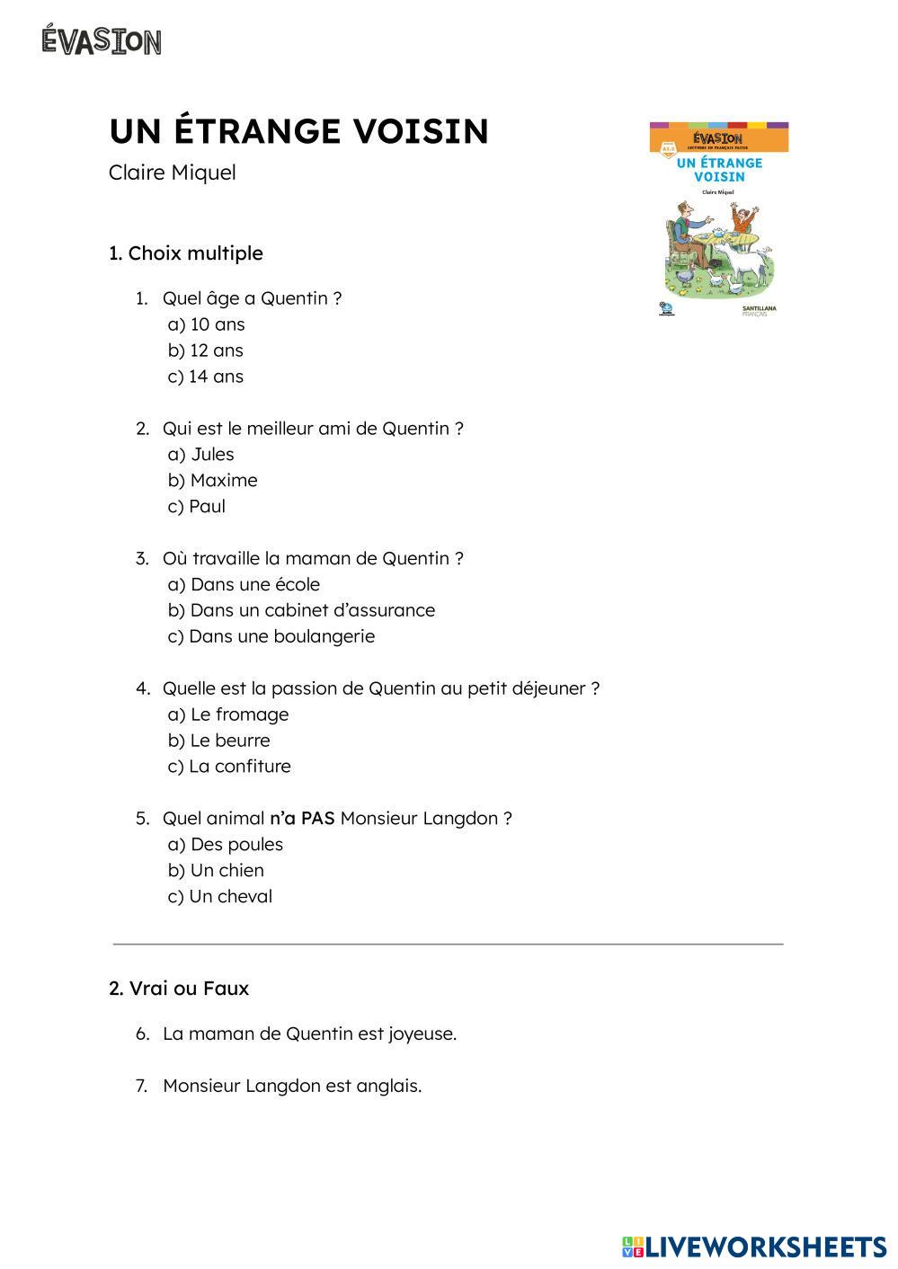 Cette activité interactive est basée sur le livre Un étrange voisin. Elle contient 25 questions de types différents (QCM, vrai/faux, textes à trous, correspondances et questions ouvertes).