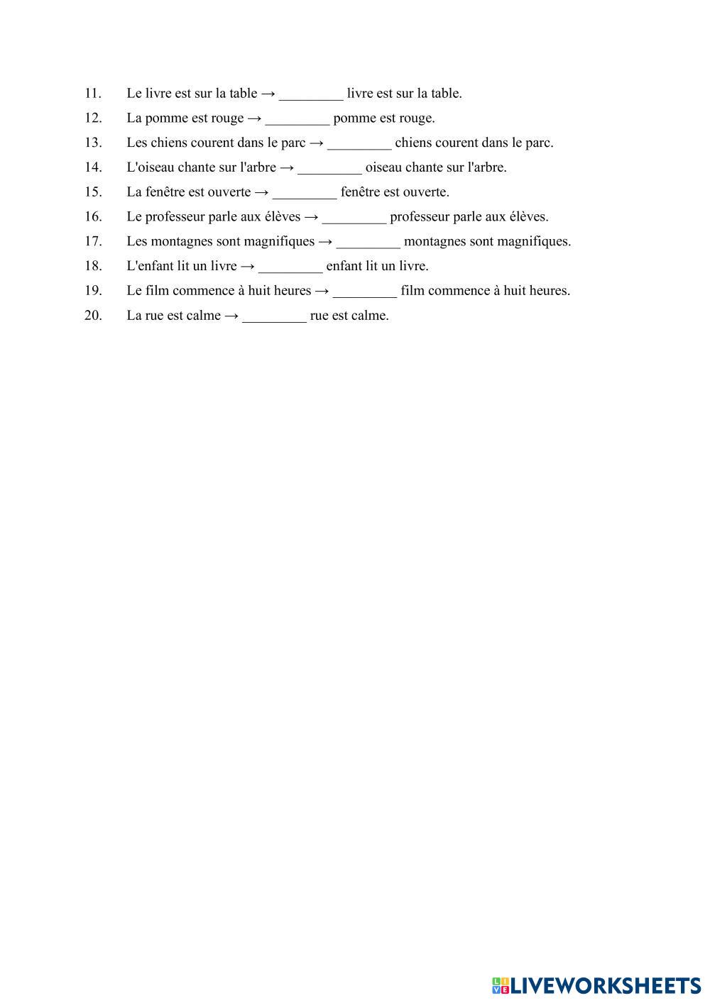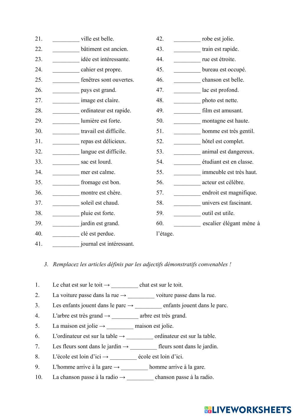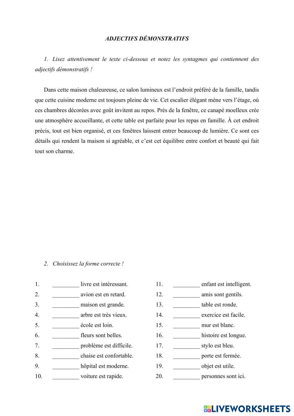 Created byChiriac Elena ESL French A2 Grammar French Author's Instructions Les élèves résoudront les activités proposées. My Google Classroom Courses × 0 classes selected (0 students total) Quick Access Select all classes (0 classes) All Classes Loading courses... Cancel Share Share to selected Course __COURSE_NAME__ __STUDENT_NAME__ (__STUDENT_EMAIL__) Les adjectifs démonstratifs Download Worksheet Validation Check my answers Emails my answers to my teacher Full name Group/level School subject Teacher's email or key code Close Submit Validating worksheet... (12) Your answers have been sent to your teacher. Good luck! OK We encountered an error submitting your answers. Please try again. OK Advertisement | Go Ad Free Created byChiriac Elena ESL French A2 Grammar French Author's Instructions Les élèves résoudront les activités proposées. Explore Worksheets Le futur simple ESL A2 Le futur simple Grammar - ESL Les élèves résoudront les activités proposées. L'expression du futur ESL A2 L'expression du futur Grammar - ESL Écoutez le dialogue et complétez avec l'expression du futur correspondante. Biographie en passé composé ESL A2 Biographie en passé composé Grammar - ESL Completar las frases con el passé composé. Conjuguez au Futur Simple ! ESL A2 Conjuguez au Futur Simple ! Grammar - ESL Συμπληρώστε τα κενά με το ρήμα στη παρένθεση στο μέλλοντα.