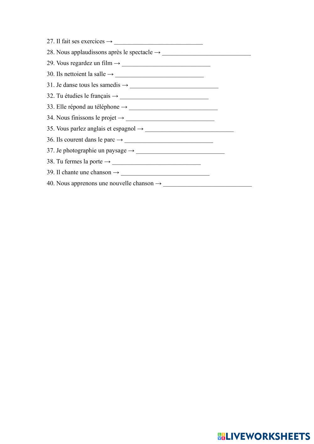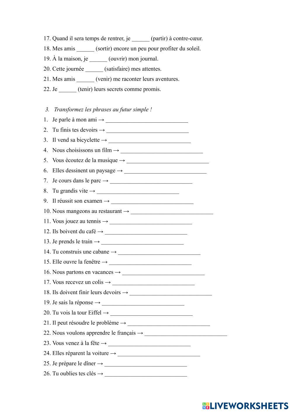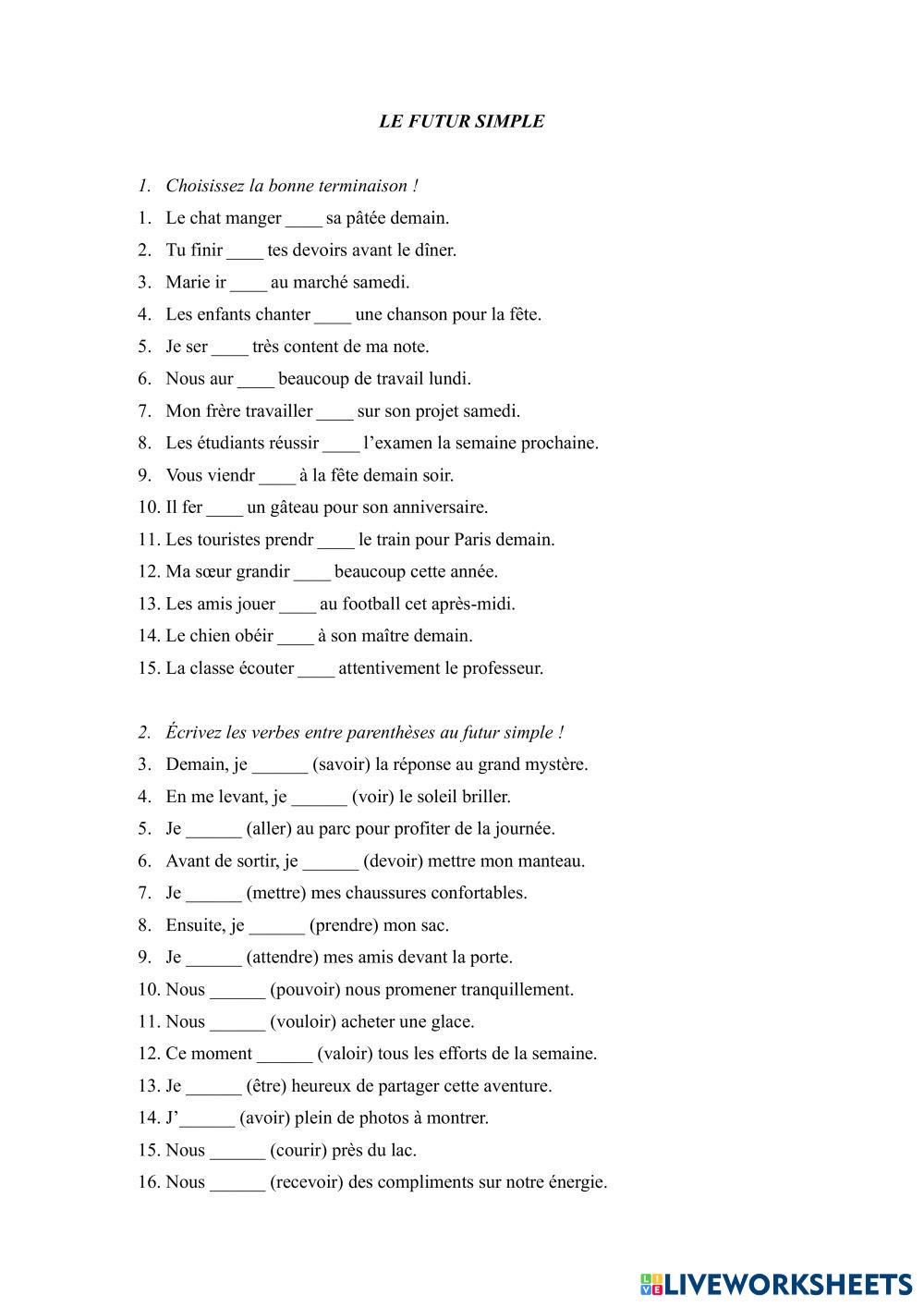 Created byChiriac Elena ESL French A2 Grammar French Author's Instructions Les élèves résoudront les activités proposées. My Google Classroom Courses × 0 classes selected (0 students total) Quick Access Select all classes (0 classes) All Classes Loading courses... Cancel Share Share to selected Course __COURSE_NAME__ __STUDENT_NAME__ (__STUDENT_EMAIL__) Le futur simple Download Worksheet Validation Check my answers Emails my answers to my teacher Full name Group/level School subject Teacher's email or key code Close Submit Validating worksheet... (12) Your answers have been sent to your teacher. Good luck! OK We encountered an error submitting your answers. Please try again. OK Advertisement | Go Ad Free Created byChiriac Elena ESL French A2 Grammar French Author's Instructions Les élèves résoudront les activités proposées. Explore Worksheets Les adjectifs démonstratifs ESL A2 Les adjectifs démonstratifs Grammar - ESL Les élèves résoudront les activités proposées. L'expression du futur ESL A2 L'expression du futur Grammar - ESL Écoutez le dialogue et complétez avec l'expression du futur correspondante. Biographie en passé composé ESL A2 Biographie en passé composé Grammar - ESL Completar las frases con el passé composé. Conjuguez au Futur Simple ! ESL A2 Conjuguez au Futur Simple ! Grammar - ESL Συμπληρώστε τα κενά με το ρήμα στη παρένθεση στο μέλλοντα.