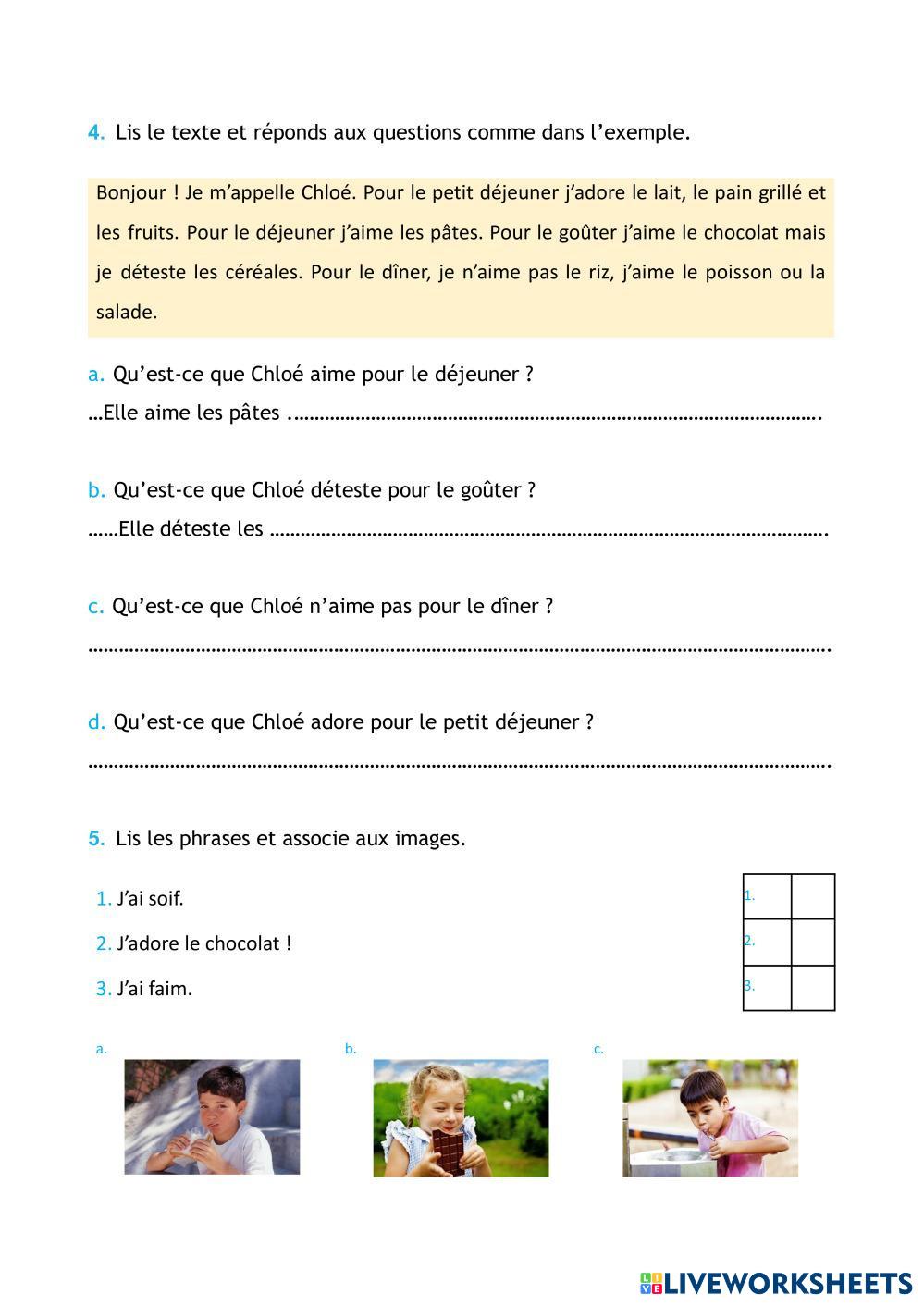 Created byLyda ESL French A1 Vocabulary French Author's Instructions Complète le test My Google Classroom Courses × 0 classes selected (0 students total) Quick Access Select all classes (0 classes) All Classes Loading courses... Cancel Share Share to selected Course __COURSE_NAME__ __STUDENT_NAME__ (__STUDENT_EMAIL__) Unité 4 À table Download Worksheet Validation Check my answers Emails my answers to my teacher Full name Group/level School subject Teacher's email or key code Close Submit Validating worksheet... (12) Your answers have been sent to your teacher. Good luck! OK We encountered an error submitting your answers. Please try again. OK Advertisement | Go Ad Free Created byLyda ESL French A1 Vocabulary French Author's Instructions Complète le test Explore Worksheets Weather words ESL A1 Weather words Vocabulary - ESL Match the French words to the English words. Weather words ESL A1 Weather words Vocabulary - ESL Match the French words to the English words. les parties du corps ESL A1 les parties du corps Vocabulary - ESL Regarde l'image, puis glisse et dépose chaque mot à sa place." Tape les noms des animaux ESL A1 Tape les noms des animaux Vocabulary - ESL Écris les noms des animaux dans la case à côté d’eux exactement comme tu les vois. Écris-les dans les deux cases.