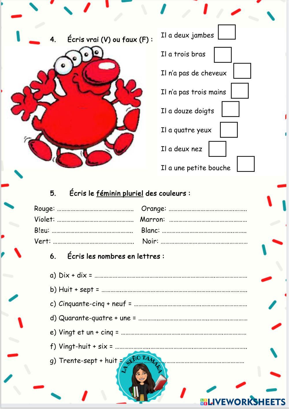 Created by Tamara27 Français Langue Étrangère (FLE) La description physique Age 10-15 level: 6º French Author's Instructions My Google Classroom Courses × 0 classes selected (0 students total) Quick Access Select all classes (0 classes) All Classes Loading courses... Cancel Share Share to selected Course __COURSE_NAME__ __STUDENT_NAME__ (__STUDENT_EMAIL__) LA DESCRIPTION PHYSIQUE Download Worksheet Validation Check my answers Emails my answers to my teacher Full name Group/level School subject Teacher's email or key code Close Submit Validating worksheet... (12) Your answers have been sent to your teacher. Good luck! OK We encountered an error submitting your answers. Please try again. OK Advertisement | Go Ad Free Created by Tamara27 Français Langue Étrangère (FLE) La description physique Age 10-15 level: 6º French Author's Instructions