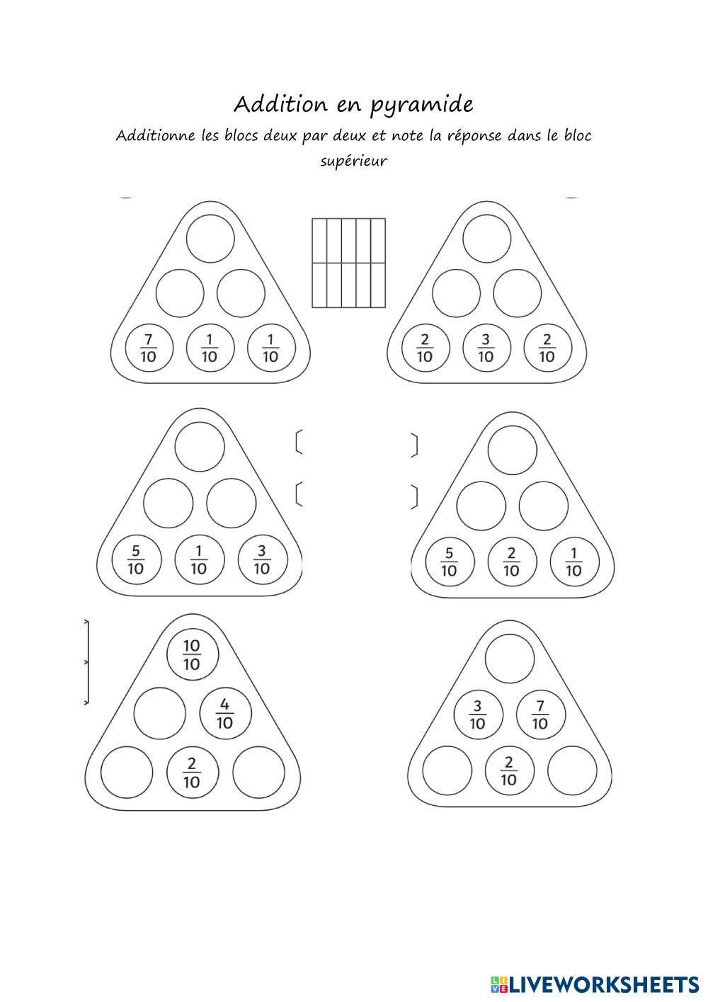 Created by PaulineGha Mathématiques Addition de fractions Age 7-13 level: grade 4 French Author's Instructions My Google Classroom Courses × 0 classes selected (0 students total) Quick Access Select all classes (0 classes) All Classes Loading courses... Cancel Share Share to selected Course __COURSE_NAME__ __STUDENT_NAME__ (__STUDENT_EMAIL__) Addition en pyramide Download Worksheet Validation Check my answers Emails my answers to my teacher Full name Group/level School subject Teacher's email or key code Close Submit Validating worksheet... (12) Your answers have been sent to your teacher. Good luck! OK We encountered an error submitting your answers. Please try again. OK Advertisement | Go Ad Free Created by PaulineGha Mathématiques Addition de fractions Age 7-13 level: grade 4 French Author's Instructions