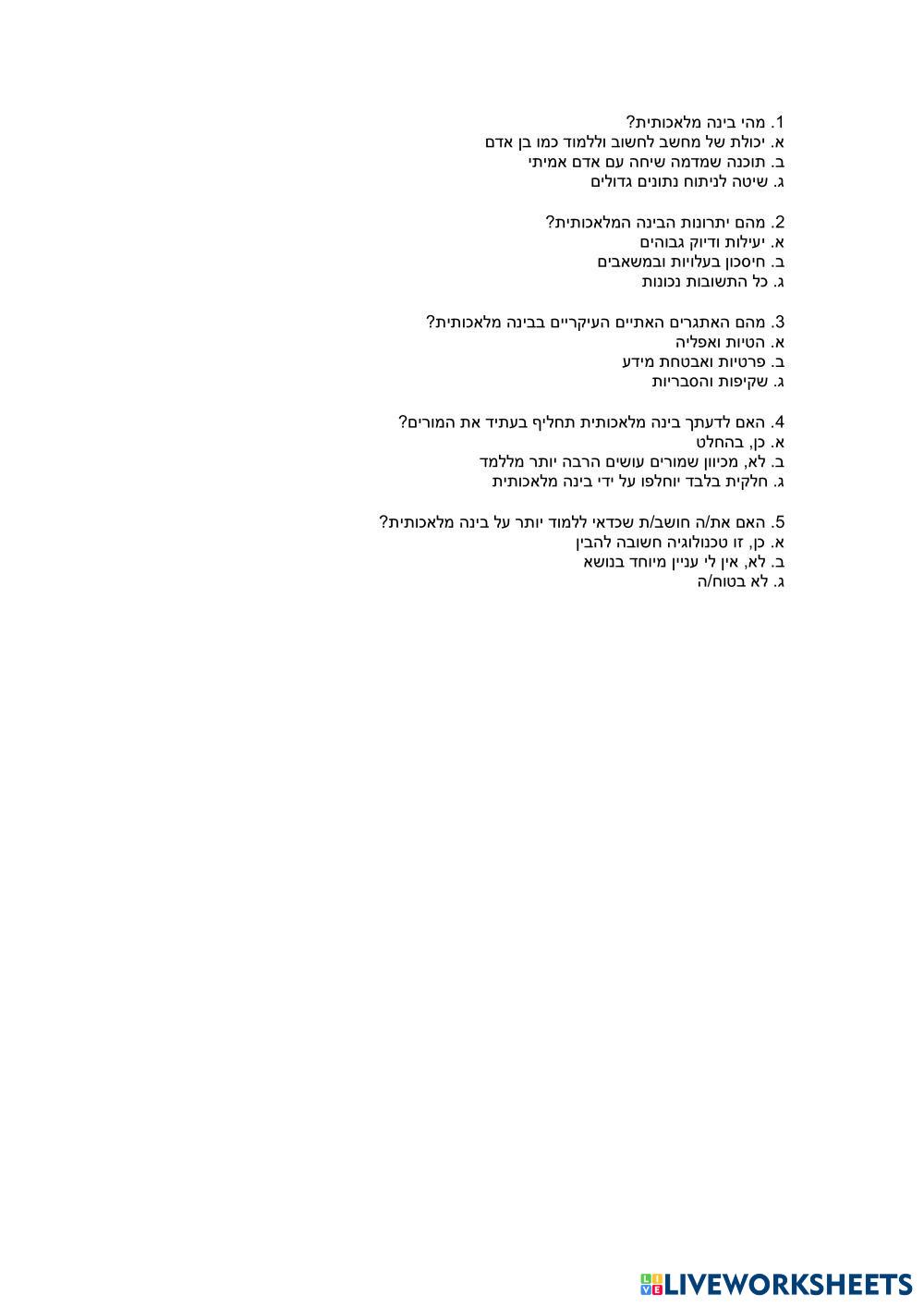 Created byefrat iluz AI GENERAL QUS ABOUT AI Age 18+ level: A Hebrew (modern) Author's Instructions My Google Classroom Courses × 0 classes selected (0 students total) Quick Access Select all classes (0 classes) All Classes Loading courses... Cancel Share Share to selected Course __COURSE_NAME__ __STUDENT_NAME__ (__STUDENT_EMAIL__) what is AI? Download Worksheet Validation Check my answers Emails my answers to my teacher Full name Group/level School subject Teacher's email or key code Close Submit Validating worksheet... (12) Your answers have been sent to your teacher. Good luck! OK We encountered an error submitting your answers. Please try again. OK Advertisement | Go Ad Free Created byefrat iluz AI GENERAL QUS ABOUT AI Age 18+ level: A Hebrew (modern) Author's Instructions