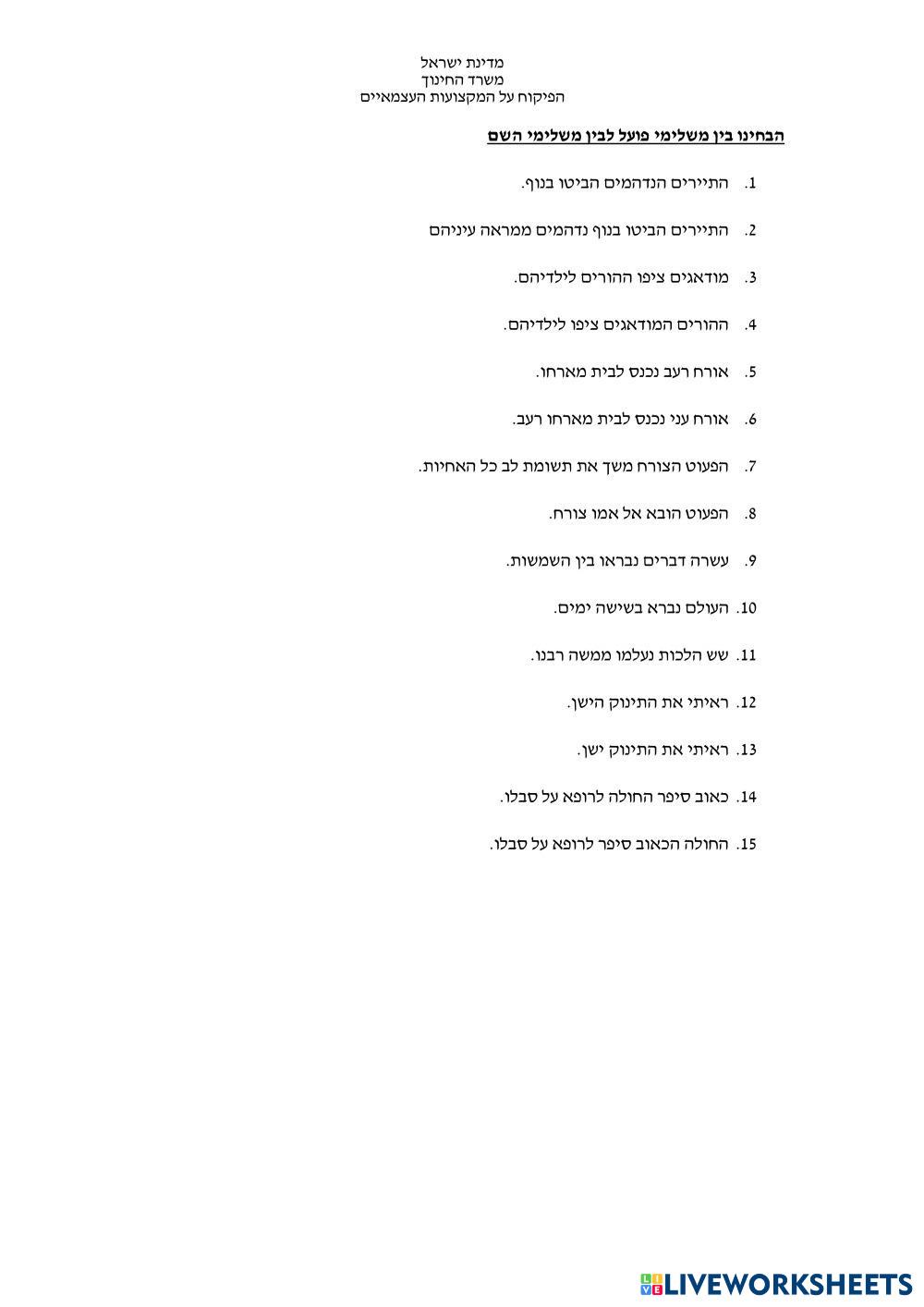 Created by shireldan English Language High School 10th grade Vocabulary Hebrew (modern) Author's Instructions כתבו מעל המילים את החלק התחבירי שלהן נושא/נשוא/נושא סתמי/נשוא מורחב/משלים פועל/משלים שם My Google Classroom Courses × 0 classes selected (0 students total) Quick Access Select all classes (0 classes) All Classes Loading courses... Cancel Share Share to selected Course __COURSE_NAME__ __STUDENT_NAME__ (__STUDENT_EMAIL__) תרגול בתחביר Download Worksheet Validation Check my answers Emails my answers to my teacher Full name Group/level School subject Teacher's email or key code Close Submit Validating worksheet... (12) Your answers have been sent to your teacher. Good luck! OK We encountered an error submitting your answers. Please try again. OK Advertisement | Go Ad Free Created by shireldan English Language High School 10th grade Vocabulary Hebrew (modern) Author's Instructions כתבו מעל המילים את החלק התחבירי שלהן נושא/נשוא/נושא סתמי/נשוא מורחב/משלים פועל/משלים שם Explore Worksheets Word Stress Identification Activity English Language 10th grade Word Stress Identification Activity Vocabulary - English Language Listen to each word and choose the syllable that is stressed.Listen to each word and choose the syllable that is stressed. Vocabulary DD Unit 9 Getting started English Language 10th grade Vocabulary DD Unit 9 Getting started Vocabulary - English Language Hello Nature and Environment English Language 10th grade Nature and Environment Vocabulary - English Language Review Life Vision B1+ Unit 5 Test English Language 10th grade Life Vision B1+ Unit 5 Test Vocabulary - English Language Read the instructions and answer the test.