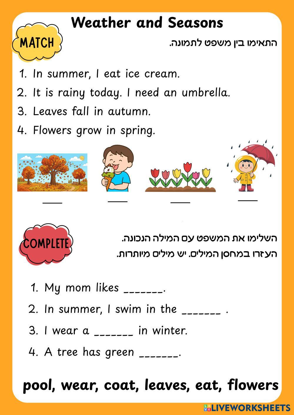 Created by dorin English Language Elementary 4th grade Vocabulary Hebrew (modern) Author's Instructions השלימו את המשימות My Google Classroom Courses × 0 classes selected (0 students total) Quick Access Select all classes (0 classes) All Classes Loading courses... Cancel Share Share to selected Course __COURSE_NAME__ __STUDENT_NAME__ (__STUDENT_EMAIL__) WEATHER AND SEASONS 2 Download Worksheet Validation Check my answers Emails my answers to my teacher Full name Group/level School subject Teacher's email or key code Close Submit Validating worksheet... (12) Your answers have been sent to your teacher. Good luck! OK We encountered an error submitting your answers. Please try again. OK Advertisement | Go Ad Free Created by dorin English Language Elementary 4th grade Vocabulary Hebrew (modern) Author's Instructions השלימו את המשימות Explore Worksheets LISTENING CLOTHING English Language 4th grade LISTENING CLOTHING Vocabulary - English Language LISTEN AND CHOOSE THE IMAGE. El crucigrama musical English Language 4th grade El crucigrama musical Vocabulary - English Language Este crucigrama musical está diseñado para trabajar vocabulario de instrumentos musicales para la asignatura de música para alumnos de 4º curso de primaria FF4_U12L5_28-31.03 English Language 4th grade FF4_U12L5_28-31.03 Vocabulary - English Language age 9-10 Nombre de los Ingredientes English Language 4th grade Nombre de los Ingredientes Vocabulary - English Language Arrastra el cartel que tienen el nombre de cada ingrediente hasta el dibujo que corresponde
