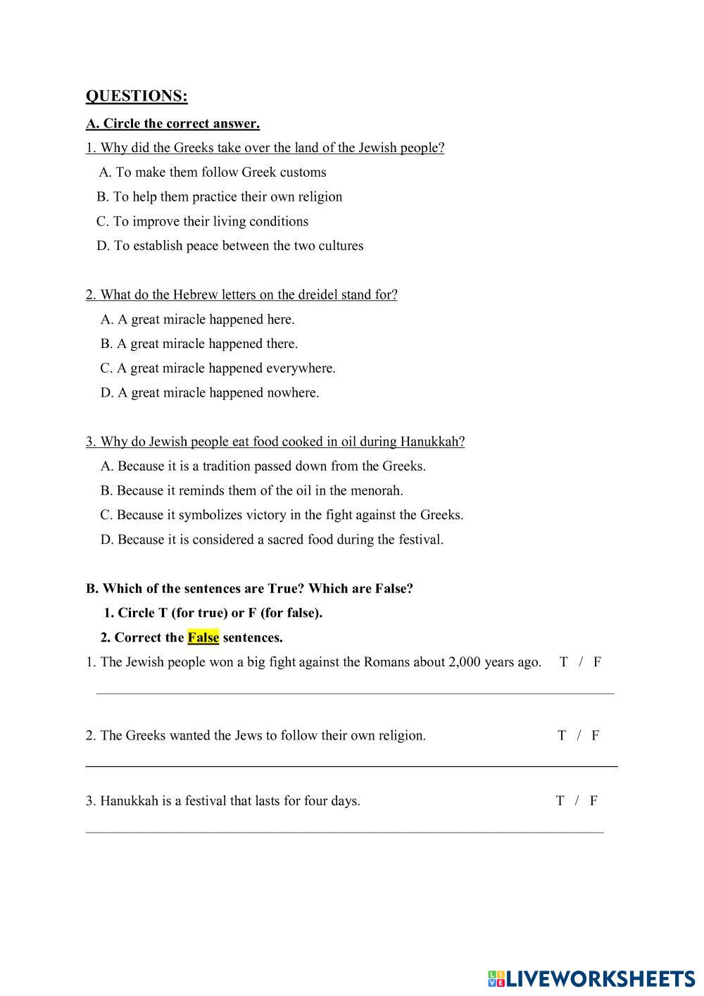 Created by Dorit13 English as a Second Language (ESL) English Age 7+ level: A1 Hebrew (modern) Author's Instructions My Google Classroom Courses × 0 classes selected (0 students total) Quick Access Select all classes (0 classes) All Classes Loading courses... Cancel Share Share to selected Course __COURSE_NAME__ __STUDENT_NAME__ (__STUDENT_EMAIL__) Festival of Lights, Hanukkah Download Worksheet Validation Check my answers Emails my answers to my teacher Full name Group/level School subject Teacher's email or key code Close Submit Validating worksheet... (12) Your answers have been sent to your teacher. Good luck! OK We encountered an error submitting your answers. Please try again. OK Advertisement | Go Ad Free Created by Dorit13 English as a Second Language (ESL) English Age 7+ level: A1 Hebrew (modern) Author's Instructions