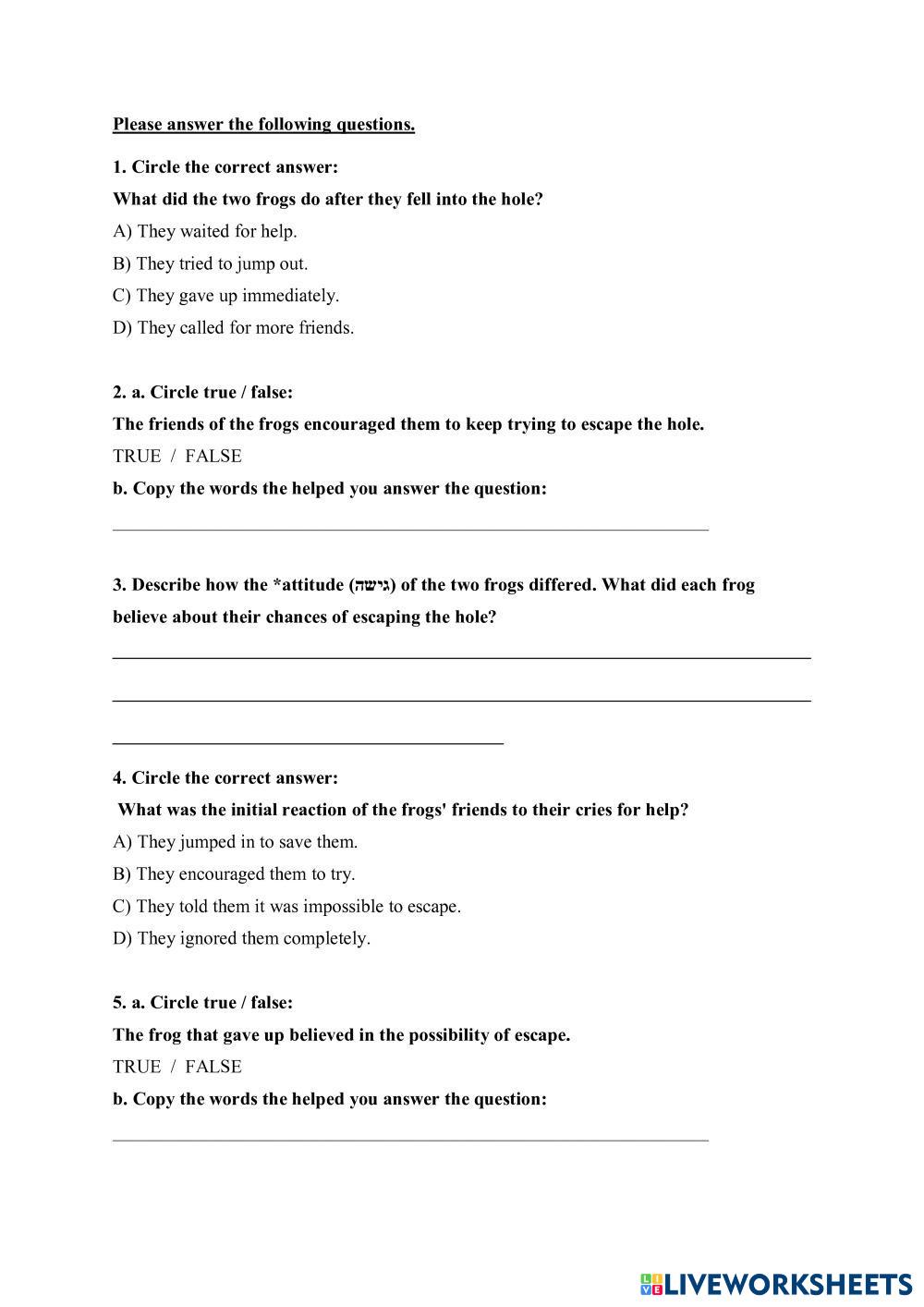 Created by Dorit13 English as a Second Language (ESL) English Age 8+ level: A1 Hebrew (modern) Author's Instructions My Google Classroom Courses × 0 classes selected (0 students total) Quick Access Select all classes (0 classes) All Classes Loading courses... Cancel Share Share to selected Course __COURSE_NAME__ __STUDENT_NAME__ (__STUDENT_EMAIL__) The Determination of the Frog Download Worksheet Validation Check my answers Emails my answers to my teacher Full name Group/level School subject Teacher's email or key code Close Submit Validating worksheet... (12) Your answers have been sent to your teacher. Good luck! OK We encountered an error submitting your answers. Please try again. OK Advertisement | Go Ad Free Created by Dorit13 English as a Second Language (ESL) English Age 8+ level: A1 Hebrew (modern) Author's Instructions