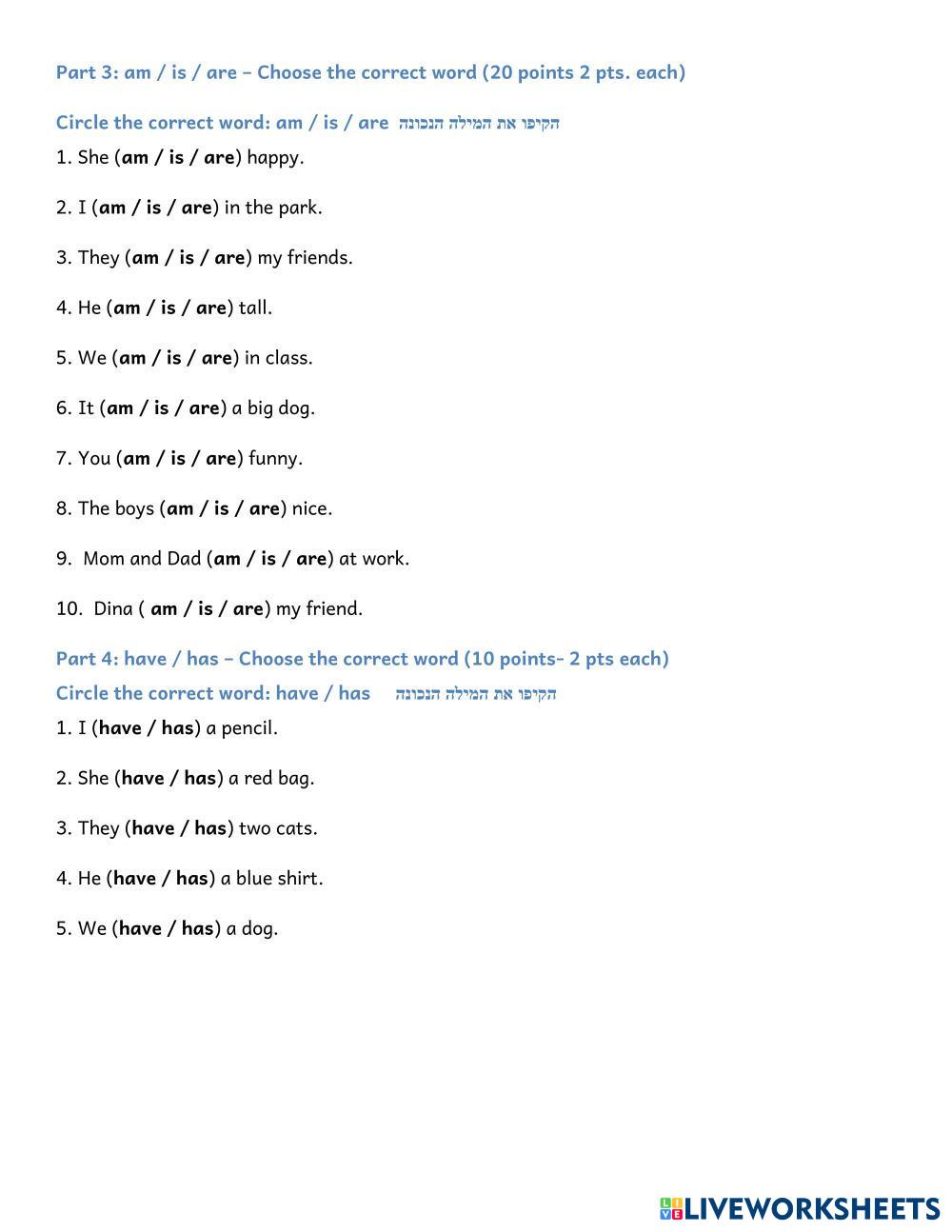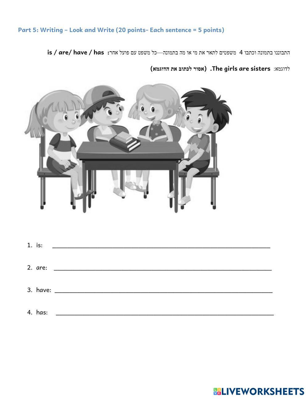 Created by susenteen ESL English A1 Grammar Hebrew (modern) Author's Instructions תענו לפי ההוראות של כל משימה My Google Classroom Courses × 0 classes selected (0 students total) Quick Access Select all classes (0 classes) All Classes Loading courses... Cancel Share Share to selected Course __COURSE_NAME__ __STUDENT_NAME__ (__STUDENT_EMAIL__) SENTENCES OF ALL KINDS Download Worksheet Validation Check my answers Emails my answers to my teacher Full name Group/level School subject Teacher's email or key code Close Submit Validating worksheet... (12) Your answers have been sent to your teacher. Good luck! OK We encountered an error submitting your answers. Please try again. OK Advertisement | Go Ad Free Created by susenteen ESL English A1 Grammar Hebrew (modern) Author's Instructions תענו לפי ההוראות של כל משימה Explore Worksheets Was or were ESL A1 Was or were Grammar - ESL English as a second language positive, negative, questions Main content: Past simple Other contents: verb to be Irregular verbs ESL A1 Irregular verbs Grammar - ESL English as a second language Simple Past & Past Participle forms of Irregular Verbs Main content: Irregular verbs Other contents: Past simple, Present Perfect A06 Unit 21 Direct and Indirect Speech ESL A1 A06 Unit 21 Direct and Indirect Speech Grammar - ESL . Present simple VS Present continous ESL A1 Present simple VS Present continous Grammar - ESL Learn the difference between these 2 tenses