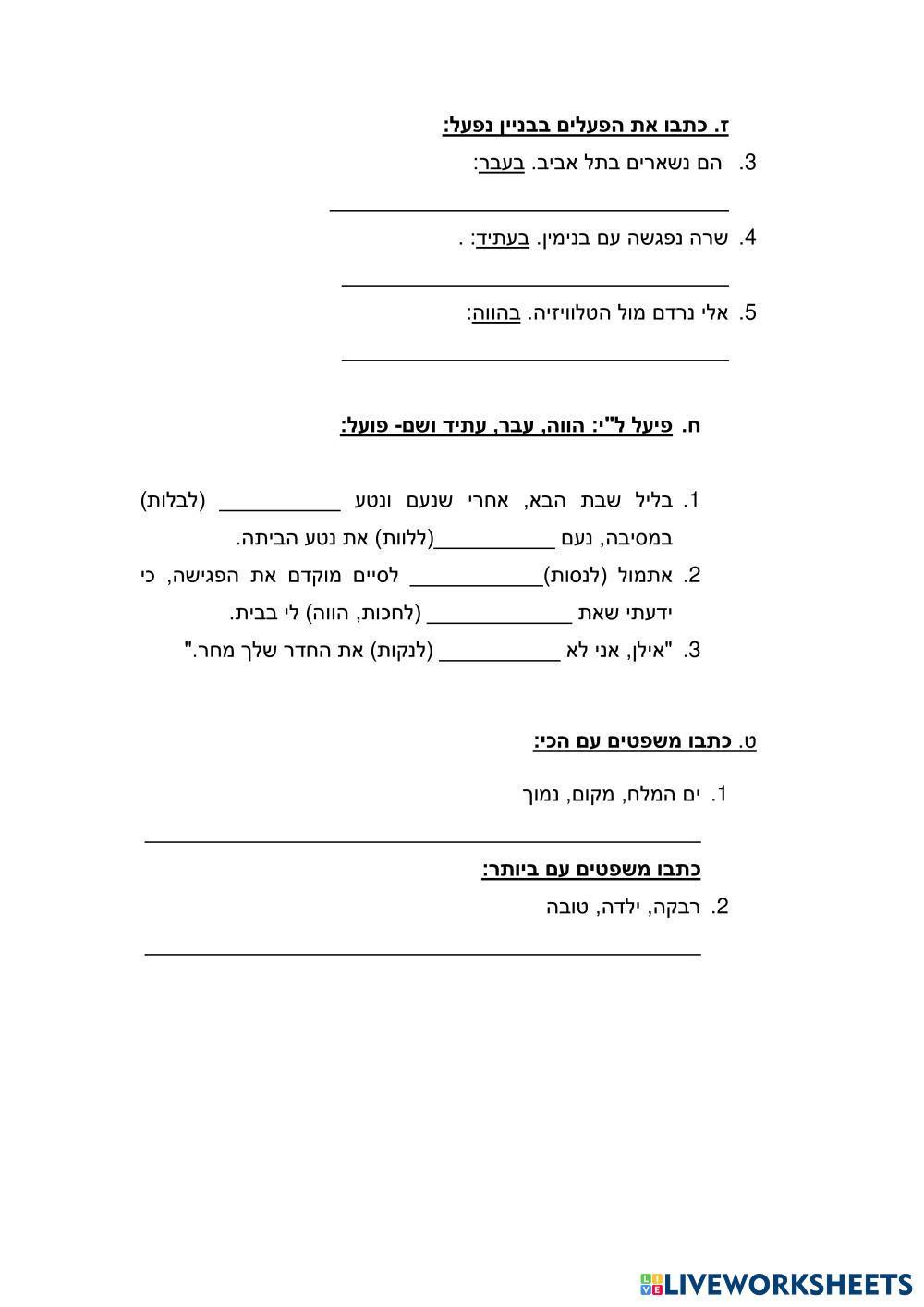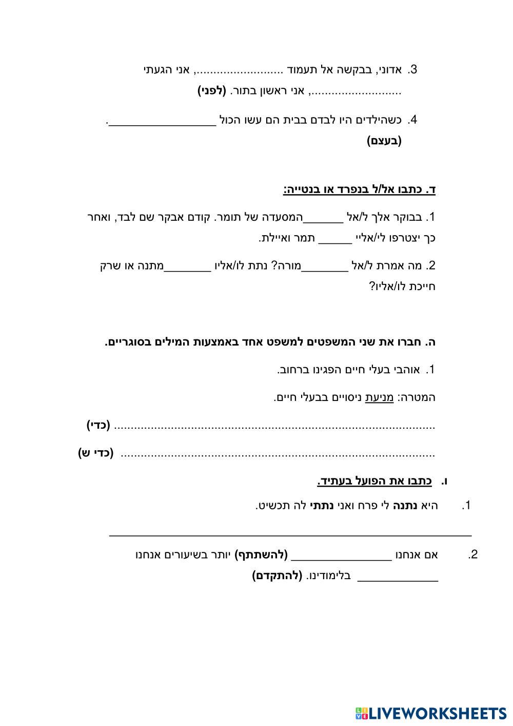 Created byRachel Steinberg ESL Hebrew B2 Grammar Hebrew (modern) Author's Instructions למלא אחר ההוראות My Google Classroom Courses × 0 classes selected (0 students total) Quick Access Select all classes (0 classes) All Classes Loading courses... Cancel Share Share to selected Course __COURSE_NAME__ __STUDENT_NAME__ (__STUDENT_EMAIL__) בוחן על פרקים 6-9 Download Worksheet Validation Check my answers Emails my answers to my teacher Full name Group/level School subject Teacher's email or key code Close Submit Validating worksheet... (12) Your answers have been sent to your teacher. Good luck! OK We encountered an error submitting your answers. Please try again. OK Advertisement | Go Ad Free Created byRachel Steinberg ESL Hebrew B2 Grammar Hebrew (modern) Author's Instructions למלא אחר ההוראות Explore Worksheets Irregular verbs-V1, V2, V3 ESL B2 Irregular verbs-V1, V2, V3 Grammar - ESL Fill in the right form of the verb מילת יחס מן ESL B2 מילת יחס מן Grammar - ESL - Past Simple vs Past Progressive ESL B2 Past Simple vs Past Progressive Grammar - ESL Fill in the blanks