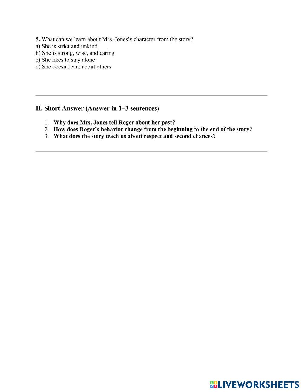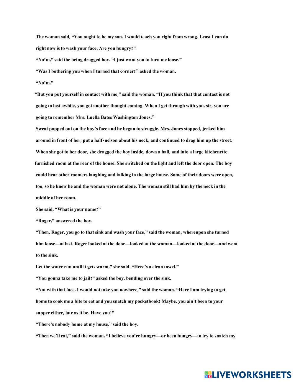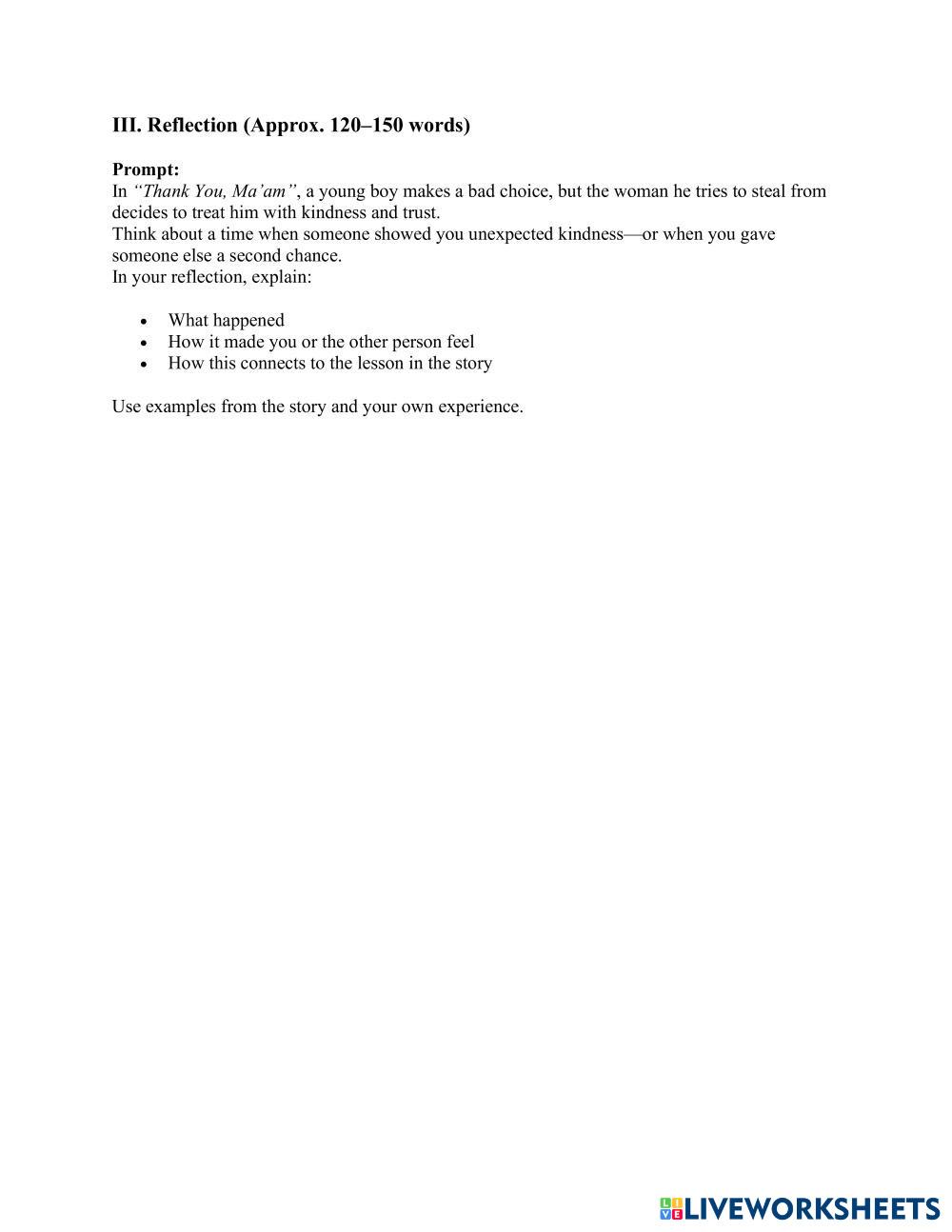 Created by YoYonatan ESL Hebrew B2-Upper Intermediate Reading Hebrew (modern) Author's Instructions Grade 12 My Google Classroom Courses × 0 classes selected (0 students total) Quick Access Select all classes (0 classes) All Classes Loading courses... Cancel Share Share to selected Course __COURSE_NAME__ __STUDENT_NAME__ (__STUDENT_EMAIL__) Thank You Ma'am Download Worksheet Validation Check my answers Emails my answers to my teacher Full name Group/level School subject Teacher's email or key code Close Submit Validating worksheet... (12) Your answers have been sent to your teacher. Good luck! OK We encountered an error submitting your answers. Please try again. OK Advertisement | Go Ad Free Created by YoYonatan ESL Hebrew B2-Upper Intermediate Reading Hebrew (modern) Author's Instructions Grade 12 Explore Worksheets Road Not Taken - R. Frost ESL B2-Upper Intermediate Road Not Taken - R. Frost Reading - ESL Grade 12 email- [email protected] The Wave Todd Strasser- Summative Assessment ESL B2-Upper Intermediate The Wave Todd Strasser- Summative Assessment Reading - ESL Grade: 12 Email: [email protected] A summer's Reading by Malamud summative assessment ESL B2-Upper Intermediate A summer's Reading by Malamud summative assessment Reading - ESL Grade : 12th teacher: Dor, Michael, Yonatan Email: [email protected]