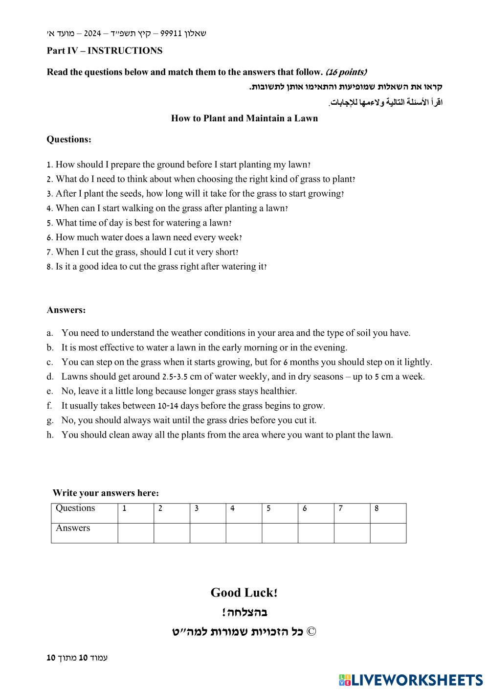Created byRon Haberman ESL English B2 Vocabulary Hebrew (modern) Author's Instructions התאימו לכל שאלה את התשובה הנכונה לה. My Google Classroom Courses × 0 classes selected (0 students total) Quick Access Select all classes (0 classes) All Classes Loading courses... Cancel Share Share to selected Course __COURSE_NAME__ __STUDENT_NAME__ (__STUDENT_EMAIL__) How to Plant and Maintain a Lawn Download Worksheet Validation Check my answers Emails my answers to my teacher Full name Group/level School subject Teacher's email or key code Close Submit Validating worksheet... (12) Your answers have been sent to your teacher. Good luck! OK We encountered an error submitting your answers. Please try again. OK Advertisement | Go Ad Free Created byRon Haberman ESL English B2 Vocabulary Hebrew (modern) Author's Instructions התאימו לכל שאלה את התשובה הנכונה לה. Explore Worksheets Landscape adjectives (advanced) ESL B2 Landscape adjectives (advanced) Vocabulary - ESL ... TRS601 – 3 themes – Review ESL B2 TRS601 – 3 themes – Review Vocabulary - ESL Do it Wedding Vocabulary B2 Multiple Choice ESL B2 Wedding Vocabulary B2 Multiple Choice Vocabulary - ESL Read the sentences and choose the correct words. TRS601 – Biology 1 – Review ESL B2 TRS601 – Biology 1 – Review Vocabulary - ESL Do it