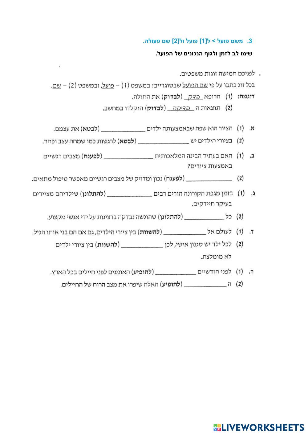 Created byanat aviv ESL B1 Writing Hebrew (modern) Author's Instructions קראו והשלימו My Google Classroom Courses × 0 classes selected (0 students total) Quick Access Select all classes (0 classes) All Classes Loading courses... Cancel Share Share to selected Course __COURSE_NAME__ __STUDENT_NAME__ (__STUDENT_EMAIL__) תרגול פועל, שם פעולה ושם פועל ממבחני עולים ב Download Worksheet Validation Check my answers Emails my answers to my teacher Full name Group/level School subject Teacher's email or key code Close Submit Validating worksheet... (12) Your answers have been sent to your teacher. Good luck! OK We encountered an error submitting your answers. Please try again. OK Advertisement | Go Ad Free Created byanat aviv ESL B1 Writing Hebrew (modern) Author's Instructions קראו והשלימו Explore Worksheets Capitalization, Punctuation marks, Spelling ESL B1 Capitalization, Punctuation marks, Spelling Writing - ESL Read the given instructions in each exercise. IELTS Foundation 2/ Mid-term - Writing ESL B1 IELTS Foundation 2/ Mid-term - Writing Writing - ESL IELTS Foundation 2/ Mid-term - Writing T2 set 2 karangan pendek(basikal) dan membaca amalan muliaSasbadi ESL B1 T2 set 2 karangan pendek(basikal) dan membaca amalan muliaSasbadi Writing - ESL jawab soalan T2 set 2 novel dan Rumusan (Lencana Sekolah) Sasbadi ESL B1 T2 set 2 novel dan Rumusan (Lencana Sekolah) Sasbadi Writing - ESL jawab solan