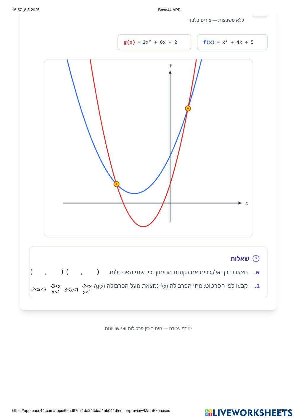 Created by iditamram Math Middle School 8th grade Functions and Graphs Hebrew (modern) Author's Instructions מצאו את נקודת החיתוך ואי השיוויון My Google Classroom Courses × 0 classes selected (0 students total) Quick Access Select all classes (0 classes) All Classes Loading courses... Cancel Share Share to selected Course __COURSE_NAME__ __STUDENT_NAME__ (__STUDENT_EMAIL__) שתי פרבולות חיתוך ואי שיוויונות Download Worksheet Validation Check my answers Emails my answers to my teacher Full name Group/level School subject Teacher's email or key code Close Submit Validating worksheet... (12) Your answers have been sent to your teacher. Good luck! OK We encountered an error submitting your answers. Please try again. OK Advertisement | Go Ad Free Created by iditamram Math Middle School 8th grade Functions and Graphs Hebrew (modern) Author's Instructions מצאו את נקודת החיתוך ואי השיוויון Explore Worksheets นนน Math 8th grade นนน Functions and Graphs - Math ยยย ใบงาน Math 8th grade ใบงาน Functions and Graphs - Math ตอบให้ถูกต้อง aaa Math 8th grade aaa Functions and Graphs - Math bjhvcgchn bvchjn Primjena funkcije Math 8th grade Primjena funkcije Functions and Graphs - Math /